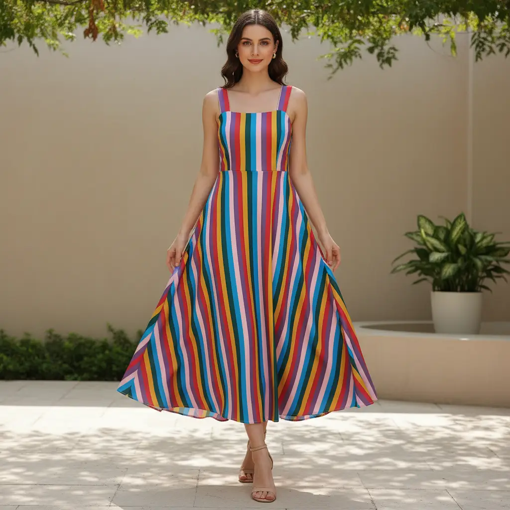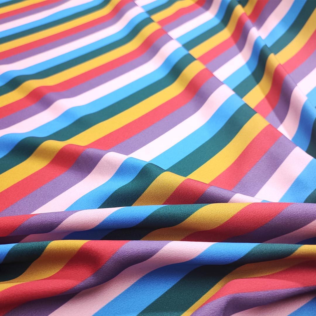 Tessuto Crepe a fantasia motivo rigato rosso – viola – rosa – verde petrolio