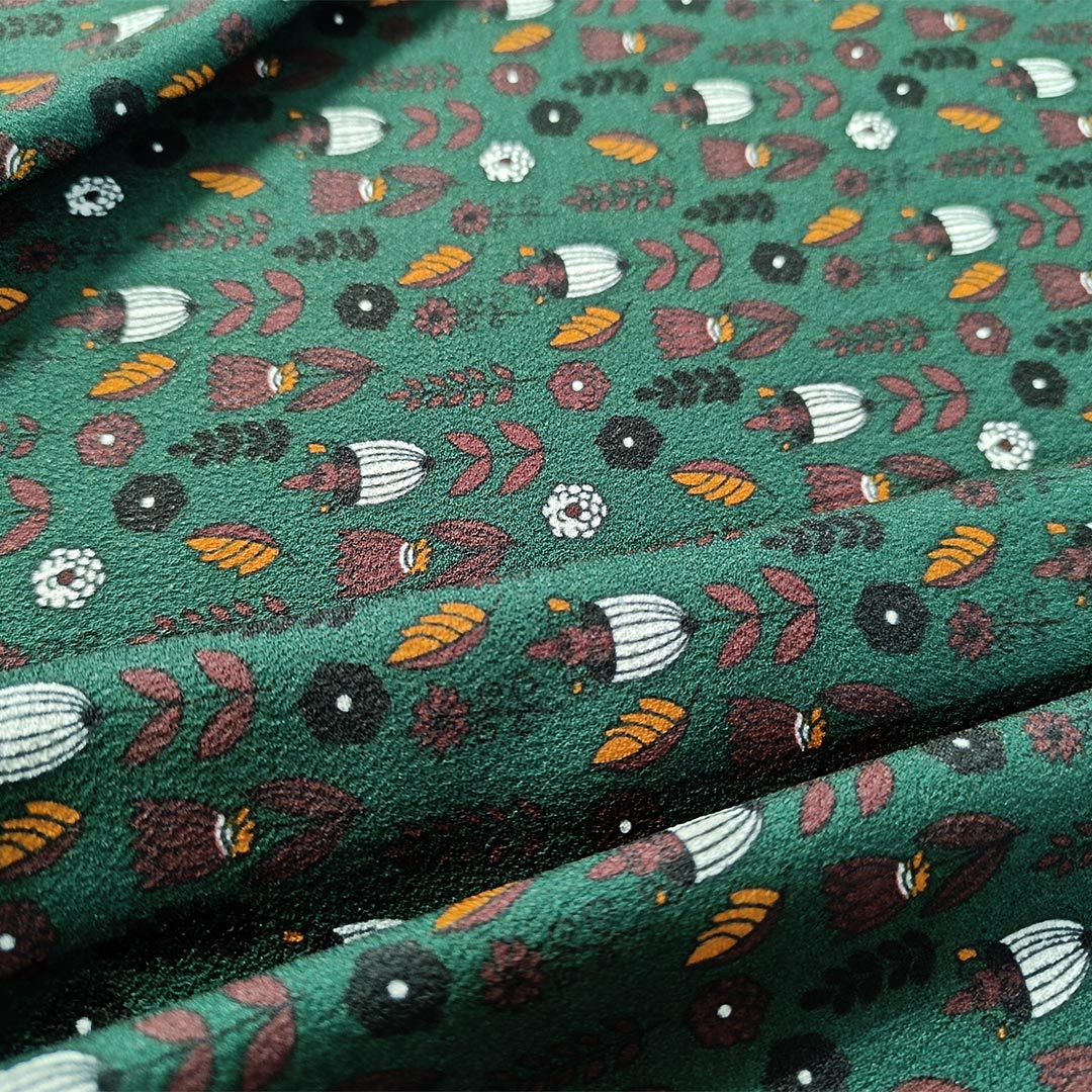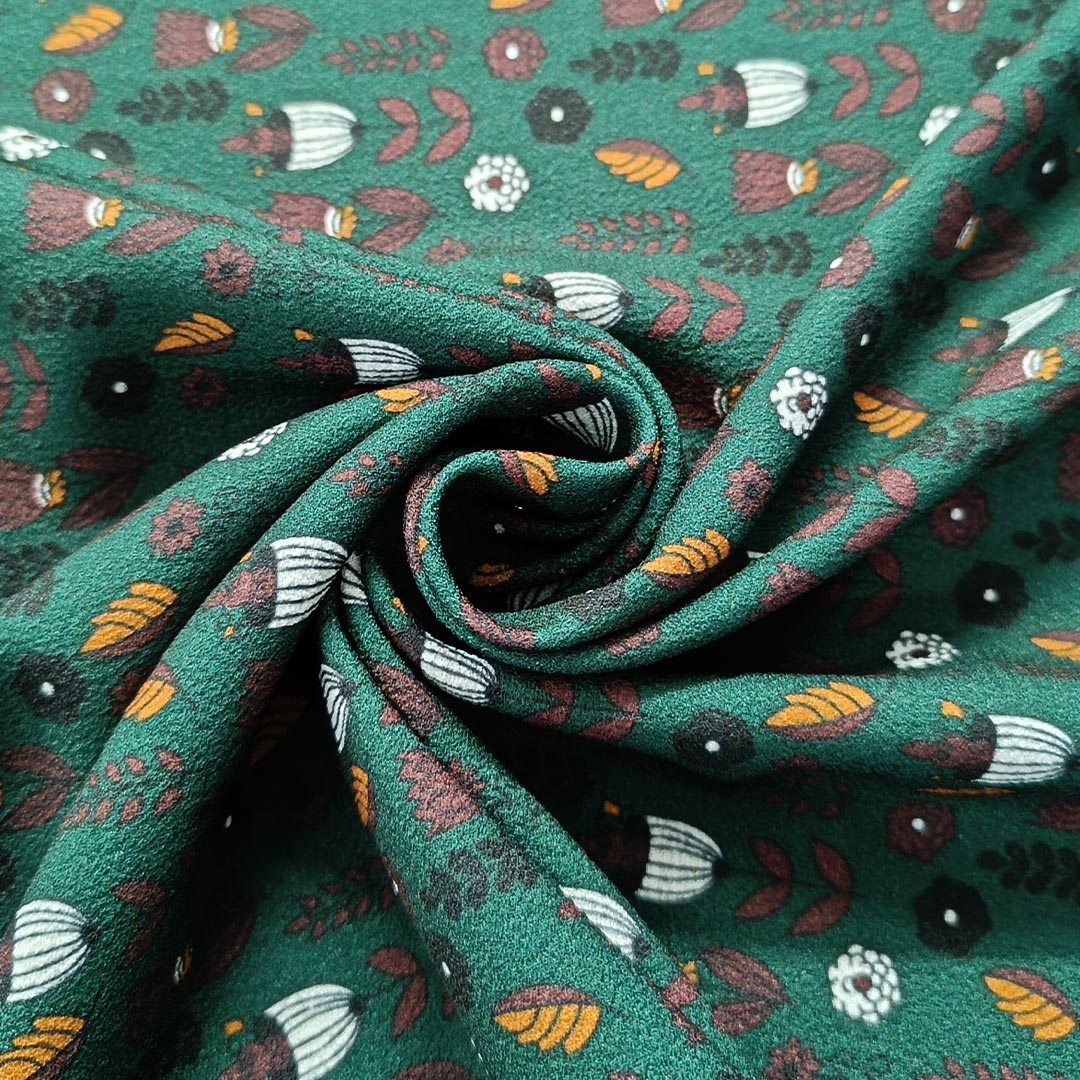 Tessuto Crepe a fantasia dalla mano rugosa, leggera e morbida, leggermente elasticizzato. Ideale per realizzare capi freschi e comodi come: abiti, camicie gonne e bluse.