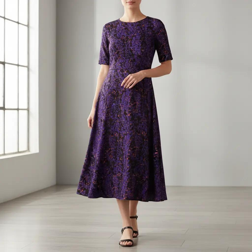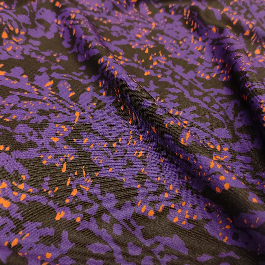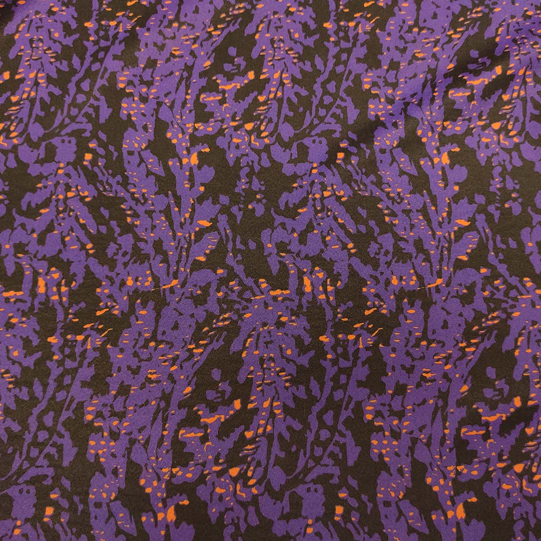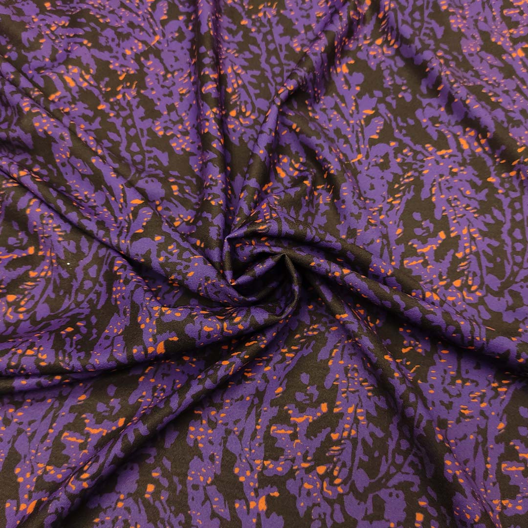 Tessuto Crepe elasticizzato a fantasia motivo astratto viola – nero
