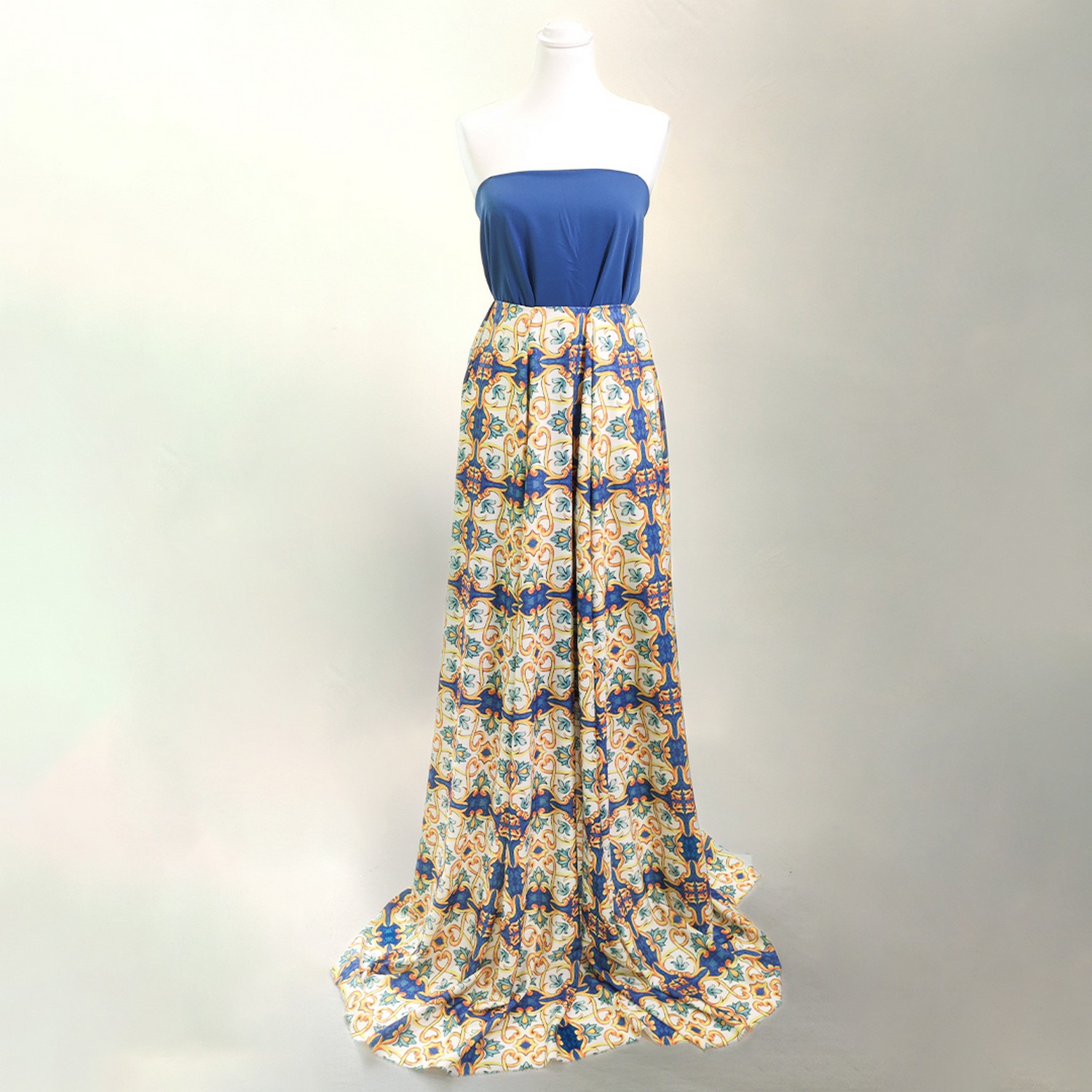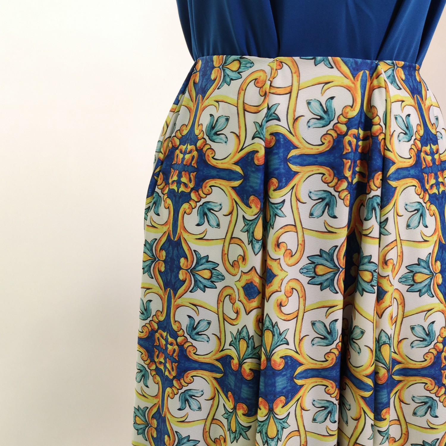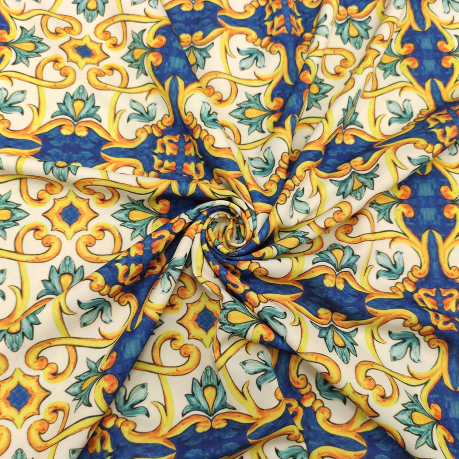 Tessuto Crepe elasticizzato a fantasia motivo blu – giallo – tiffany