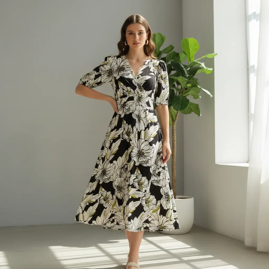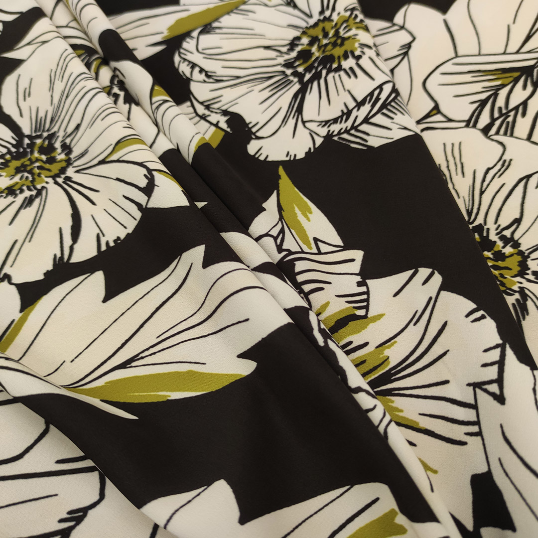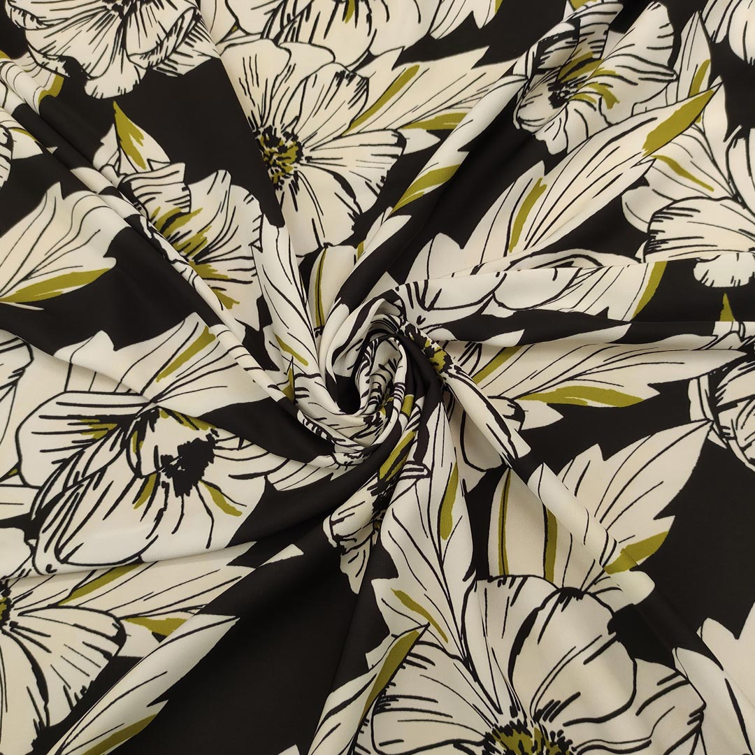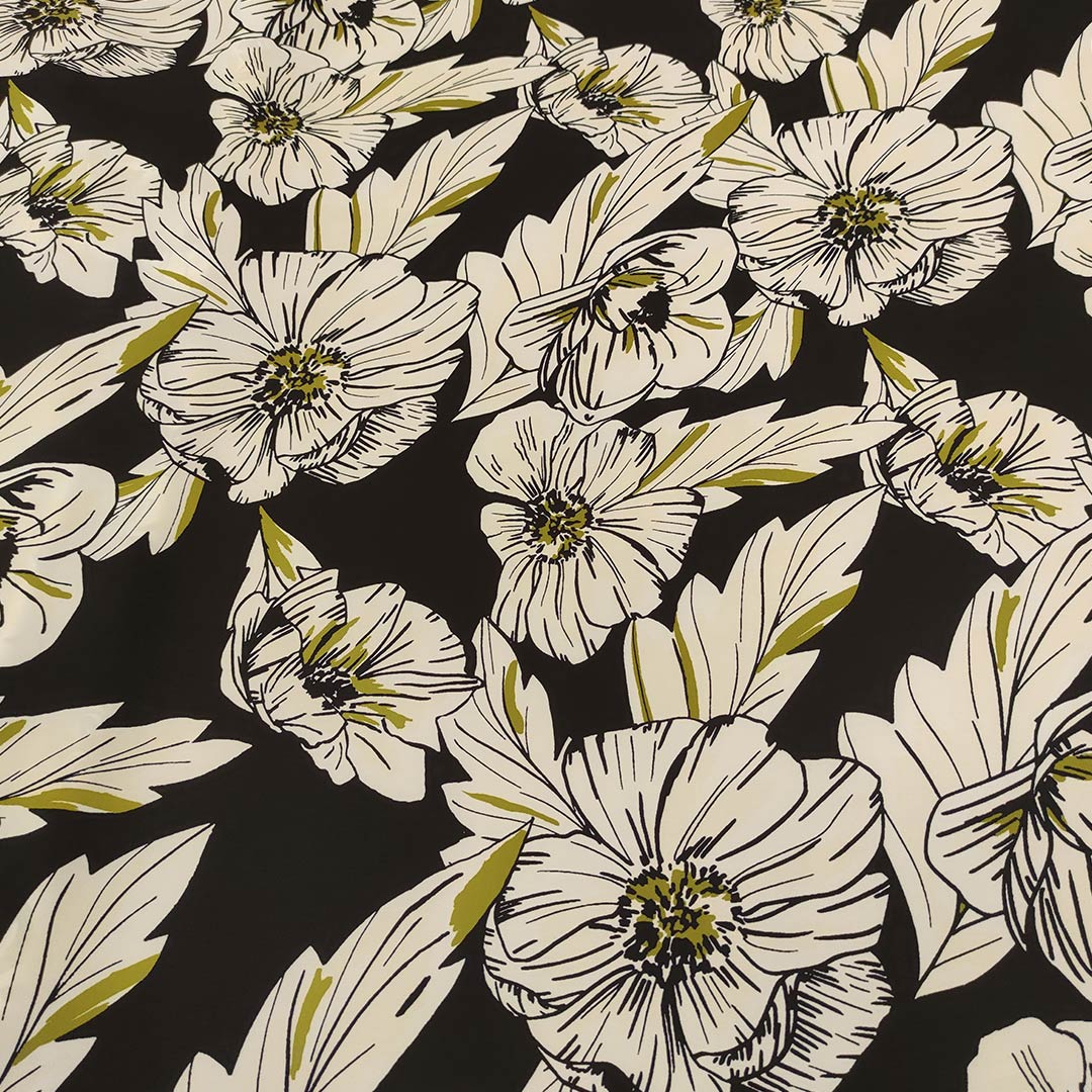 Tessuto Crepe elasticizzato a fantasia motivo floreale bianco – nero – verde