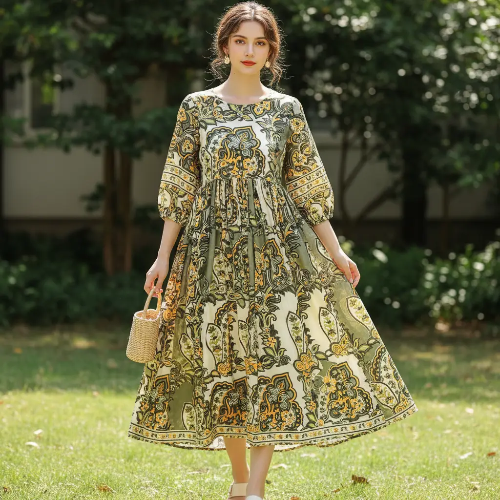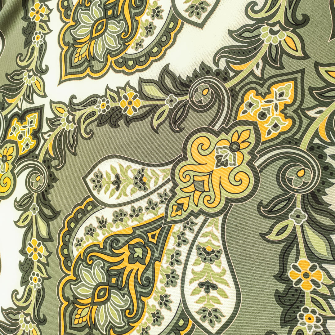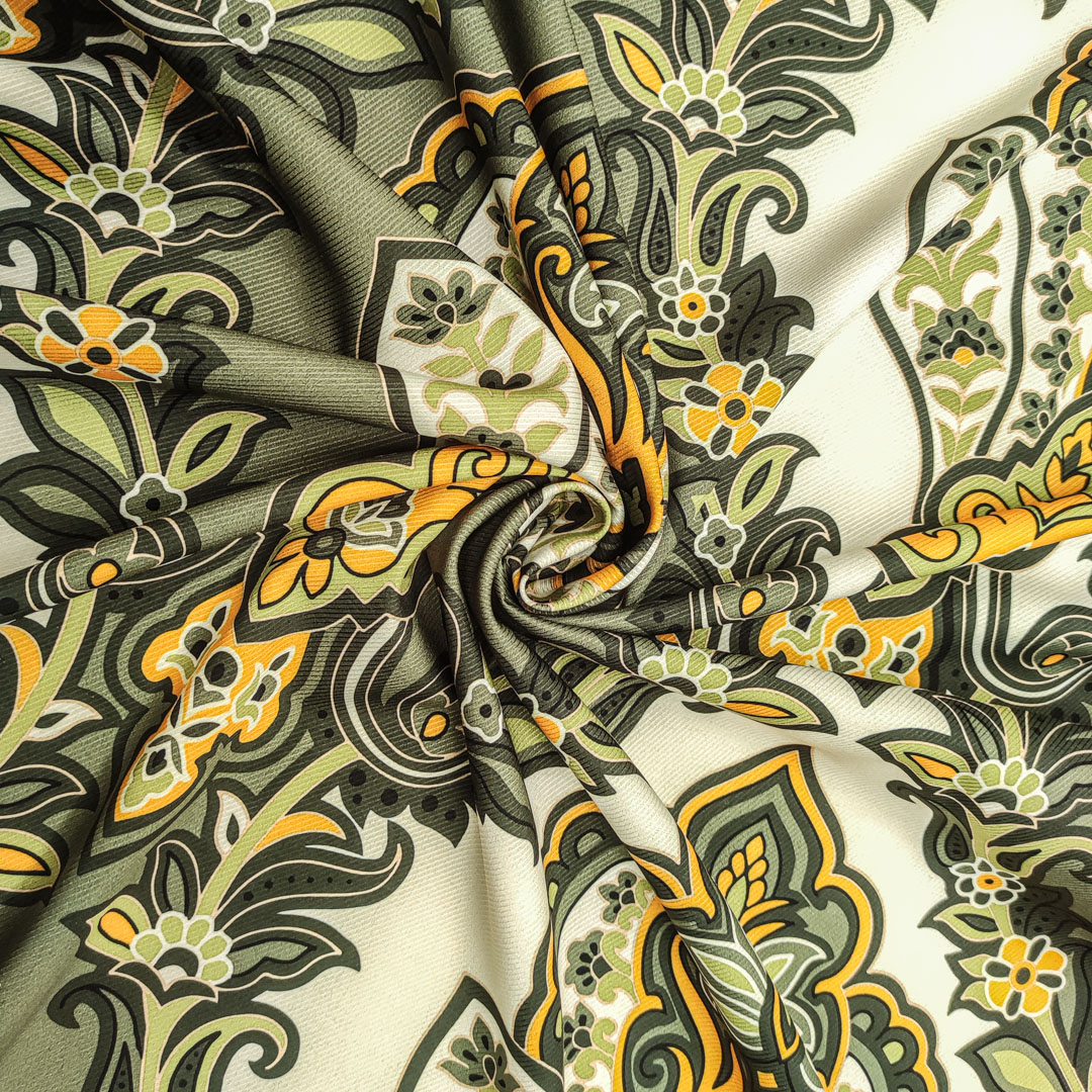 Tessuto Crepe elasticizzato a fantasia motivo floreale cashmere verde – panna – ocra