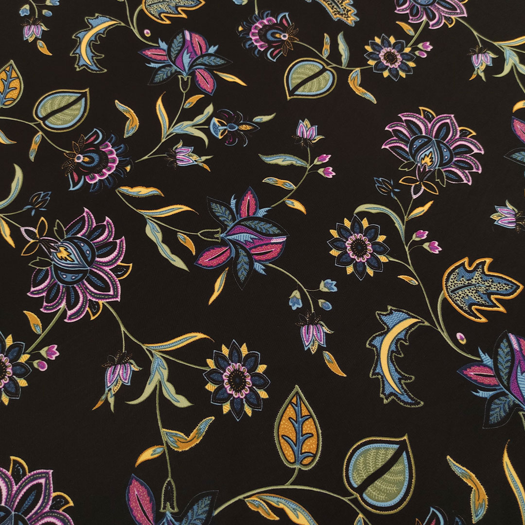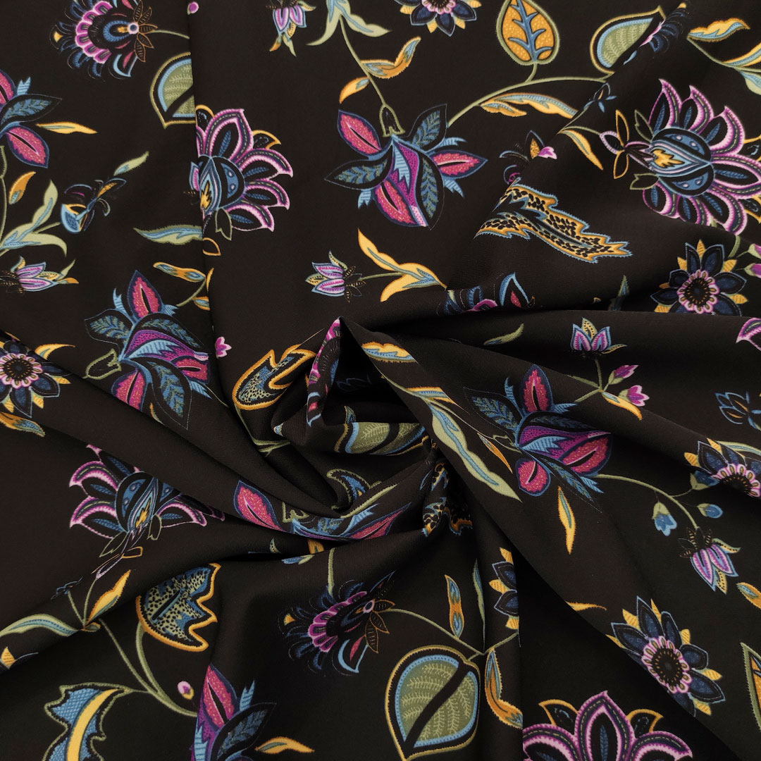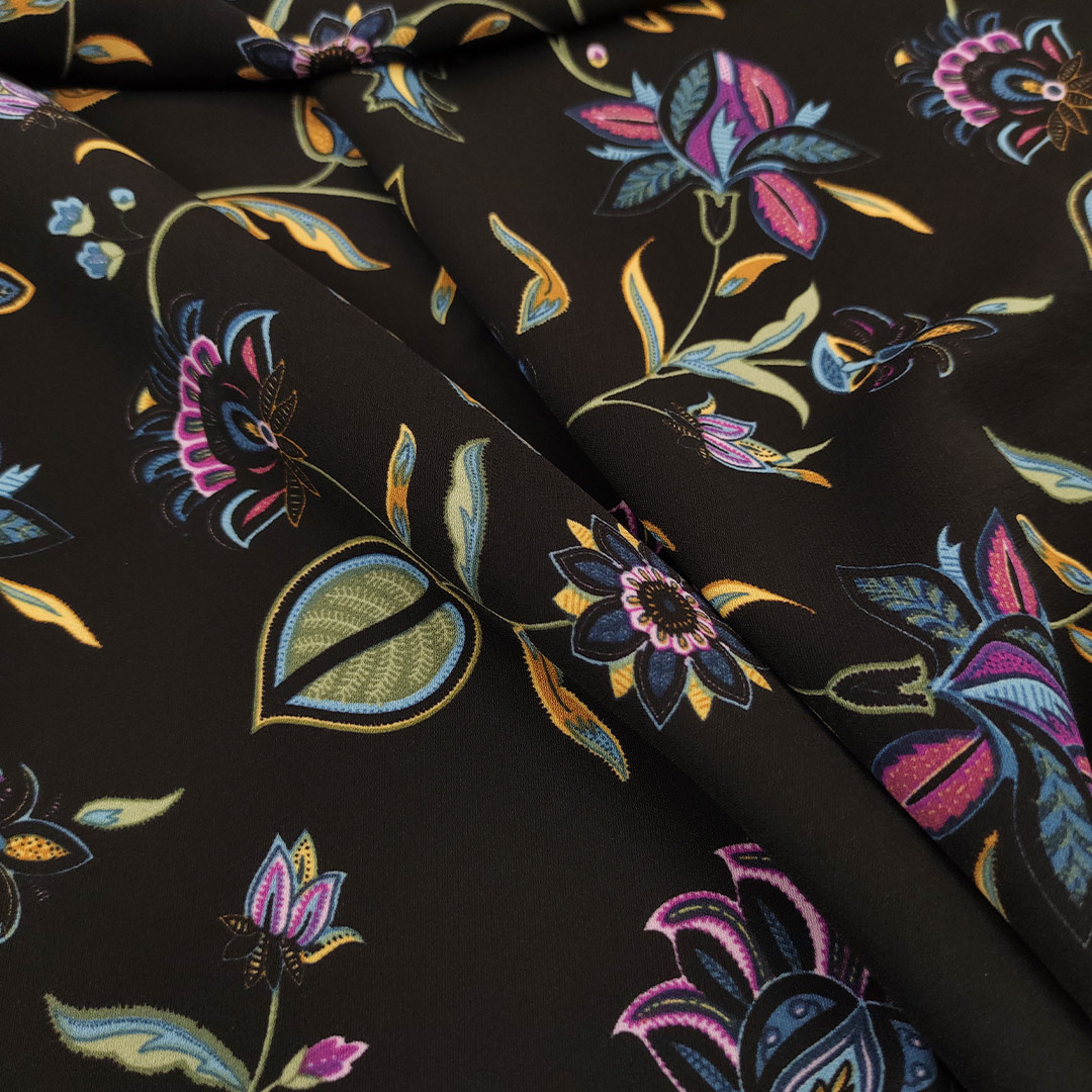 Tessuto Crepe elasticizzato a fantasia motivo floreale nero – viola – giallo