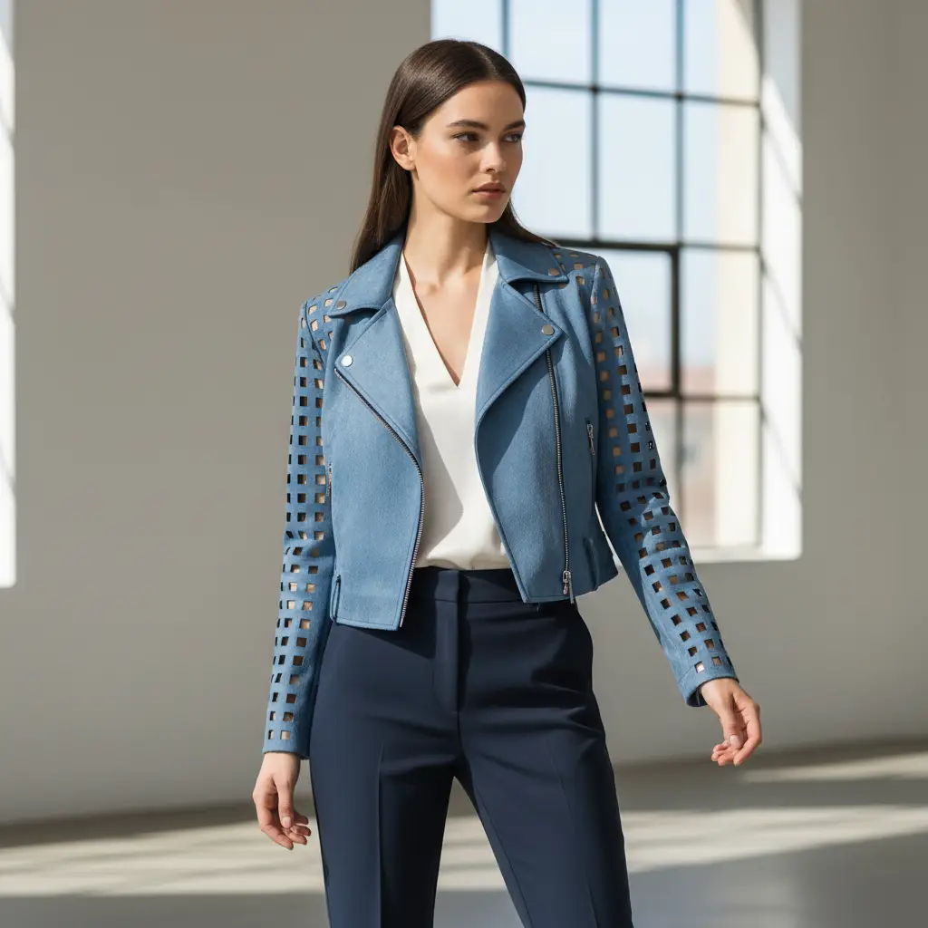 Tessuto Simil Dainetto traforato dalla mano morbida e resistente, leggermente elasticizzato, dal peso medio ideale per realizzare capi morbidi e pratici come: giacche, gonne e pantaloni.