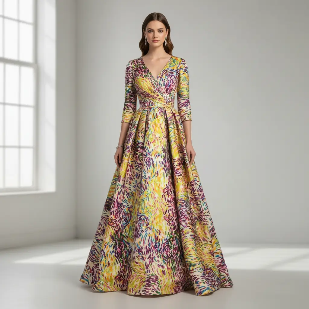 Tessuto Duchesse a fantasia dalla mano semirigida e rasata, dall’aspetto semilucido ideale per realizzare capi da cerimonia come: gonnelloni, abiti, gonne, giacche, tailleur e basi per abiti da sposa.