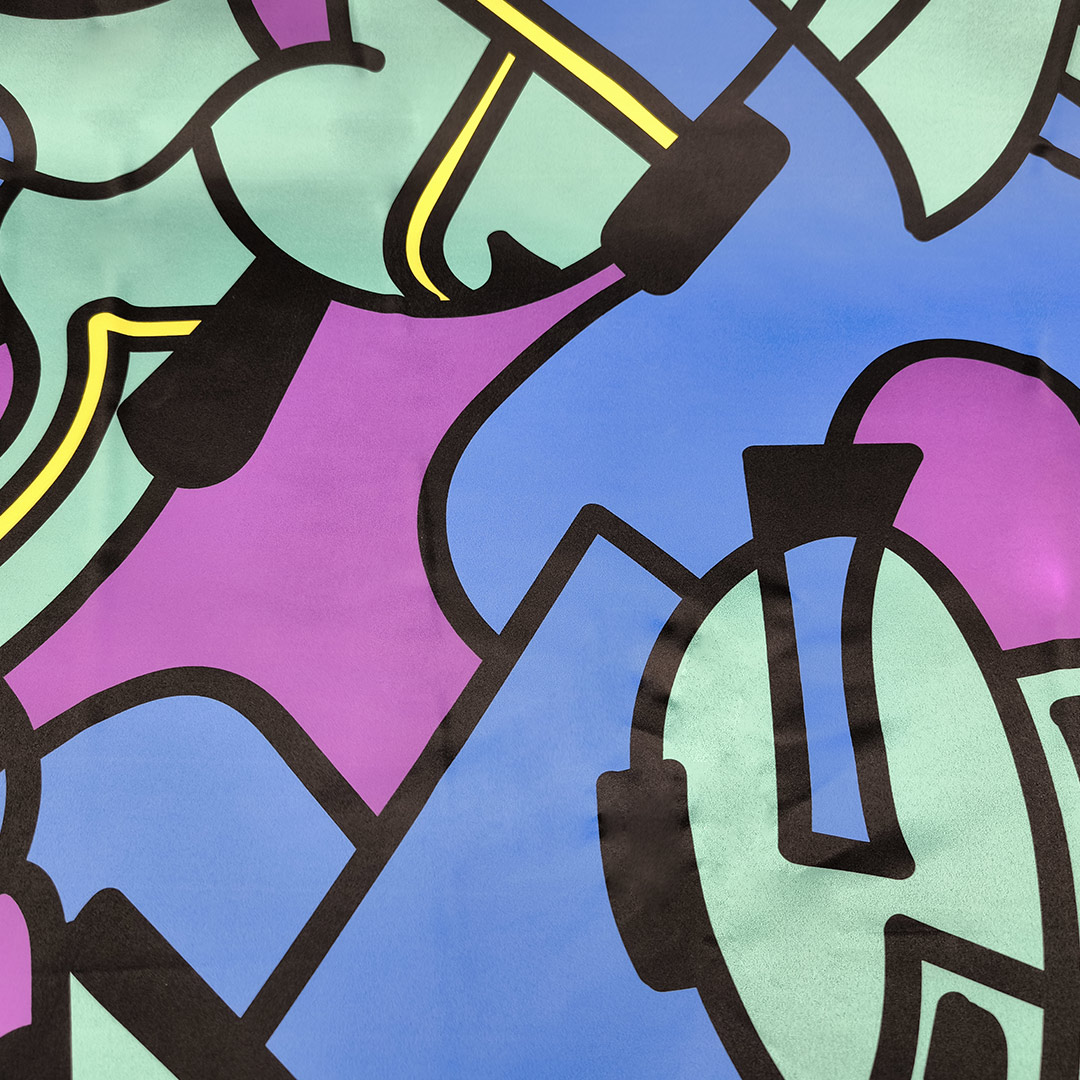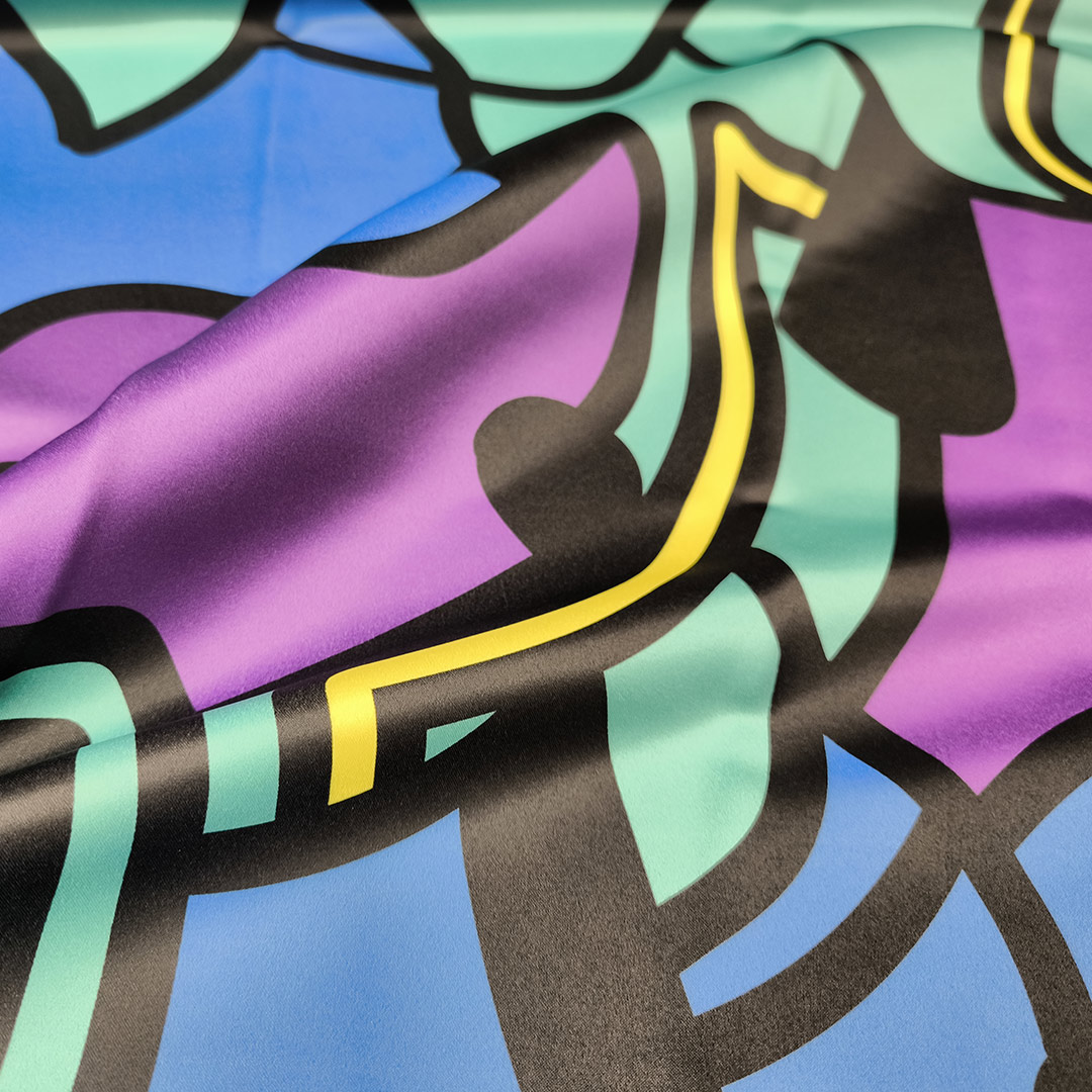 Tessuto Duchesse a fantasia motivo astratto blu elettrico – viola – nero – verde smeraldo