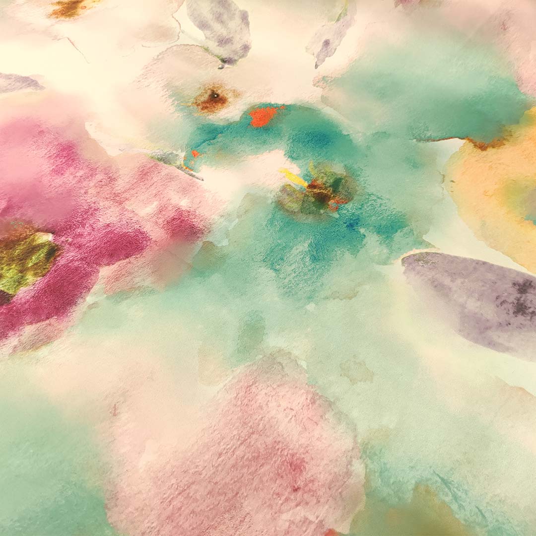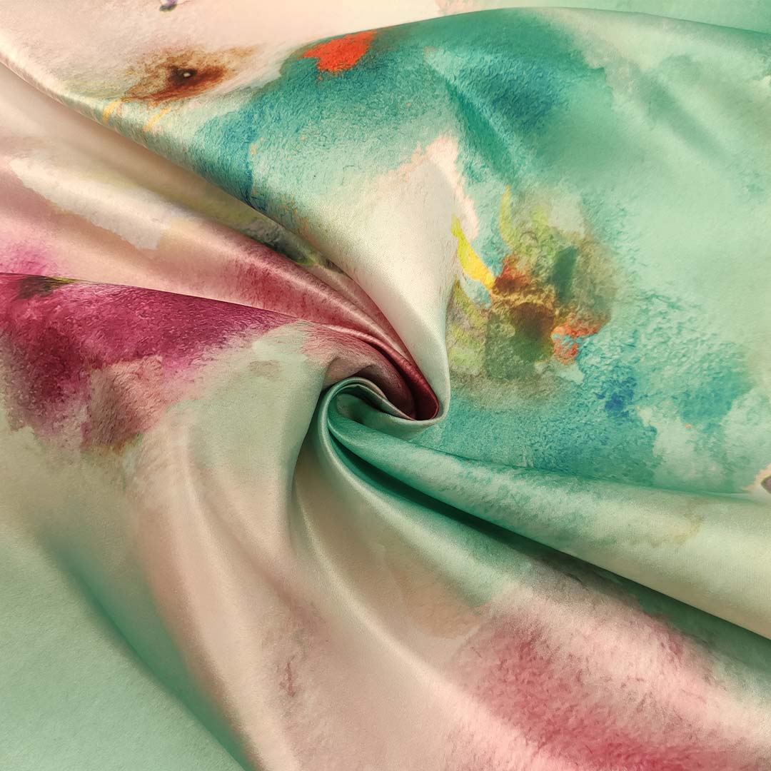 Tessuto Duchesse a fantasia motivo astratto fucsia – giallo – acquamarina
