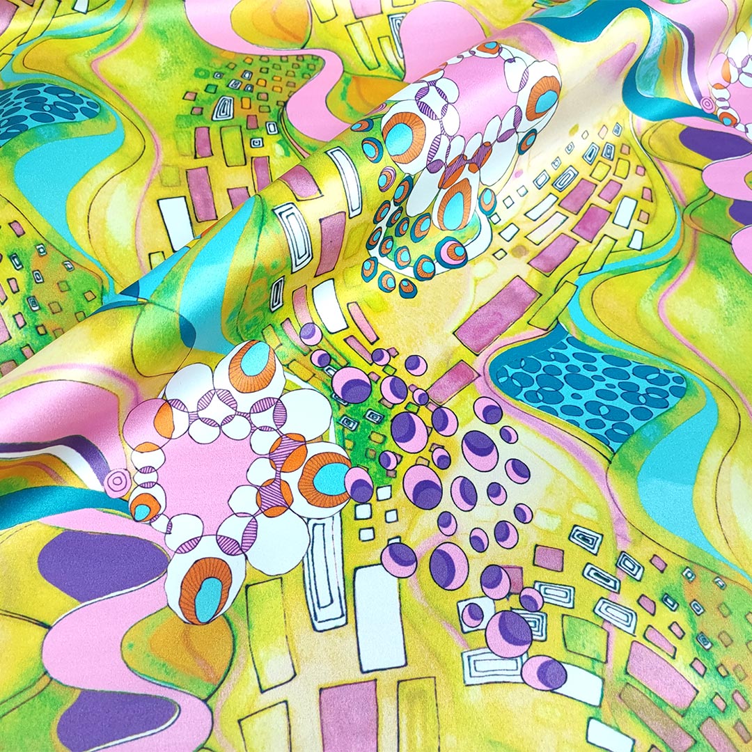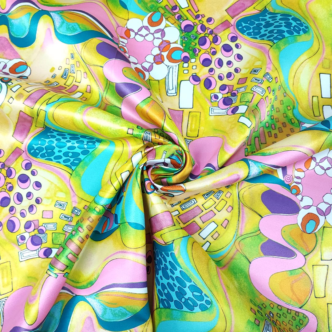 Tessuto Duchesse a fantasia motivo astratto giallo – fucsia – turchese