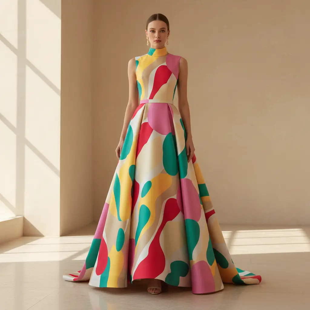 Tessuto Duchesse a fantasia dalla mano semirigida e rasata, dall’aspetto semilucido ideale per realizzare capi da cerimonia come: gonnelloni, abiti, gonne, giacche, tailleur e basi per abiti da sposa.