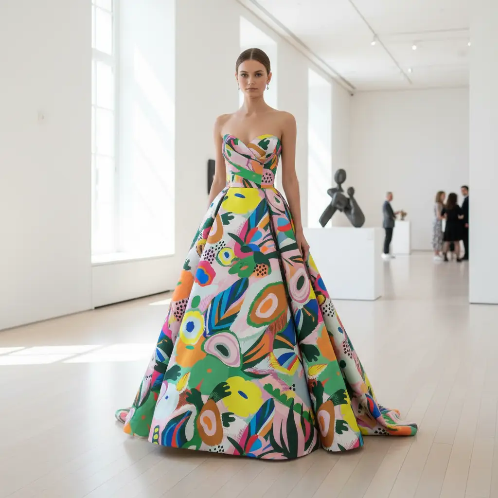 Tessuto Duchesse a fantasia dalla mano semirigida e rasata, dall’aspetto semilucido ideale per realizzare capi da cerimonia come: gonnelloni, abiti, gonne, giacche, tailleur e basi per abiti da sposa.