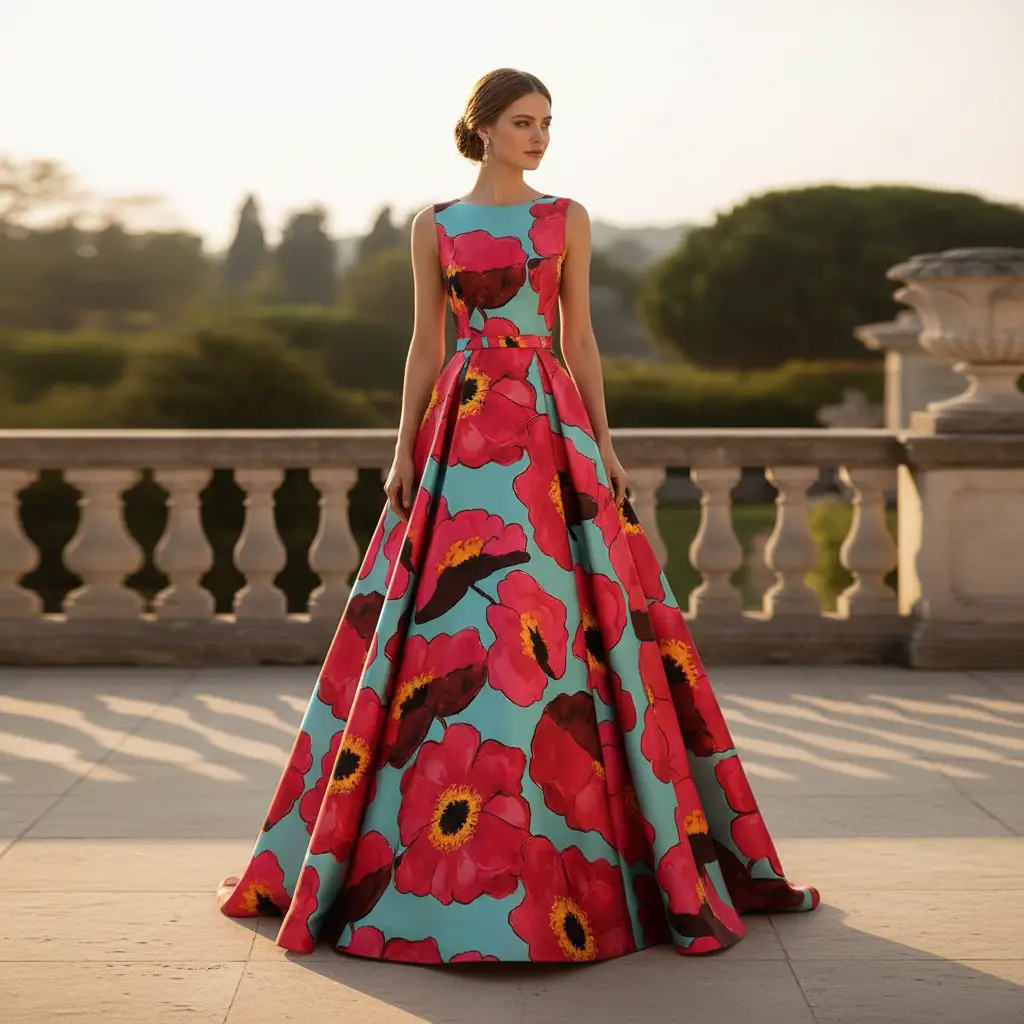 Tessuto Duchesse a fantasia dalla mano semirigida e rasata, dall’aspetto semilucido ideale per realizzare capi da cerimonia come: gonnelloni, abiti, gonne, giacche, tailleur e basi per abiti da sposa.