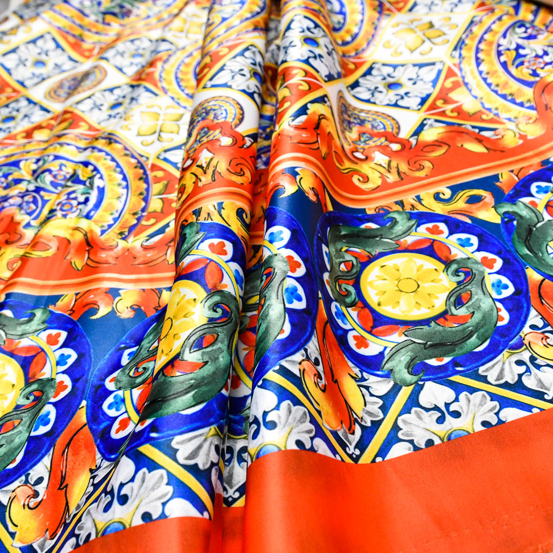 Tessuto Duchesse a fantasia motivo floreale barocco giallo – blu elettrico – rosso