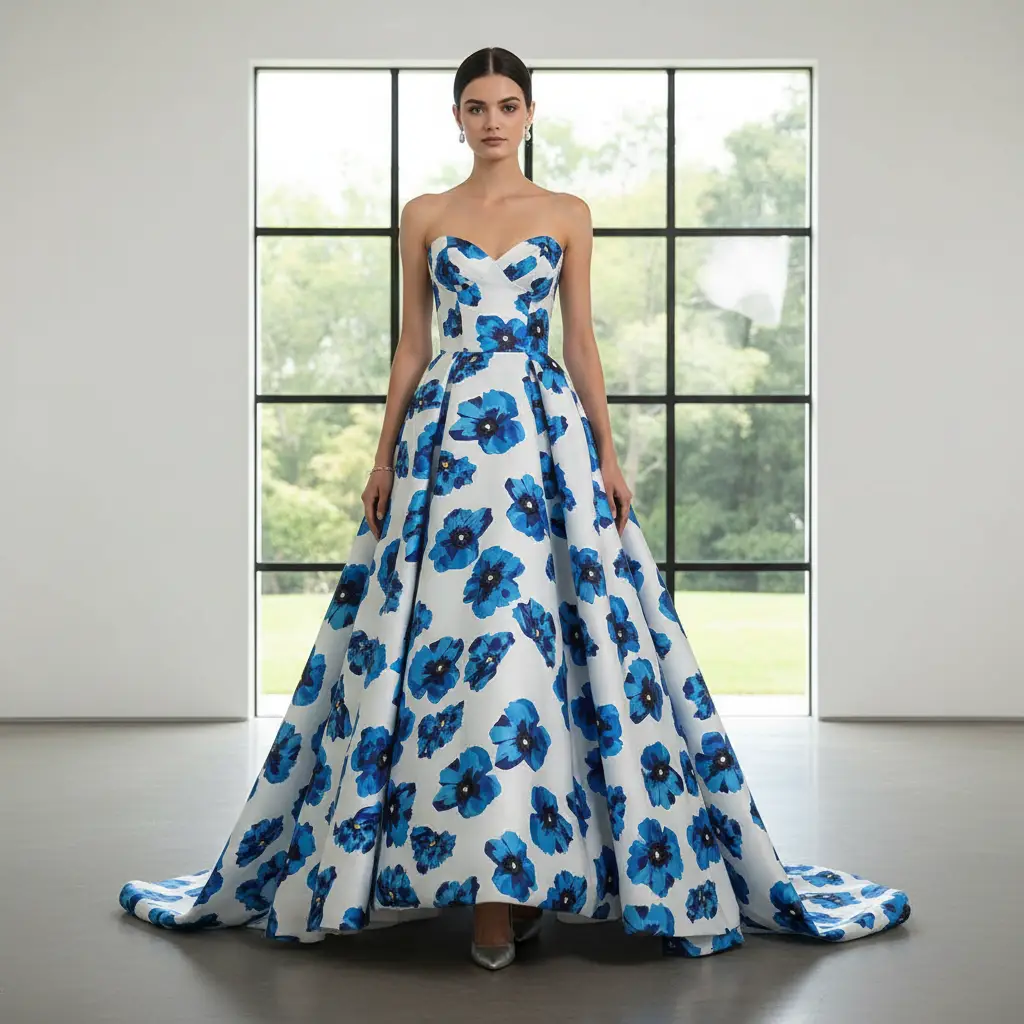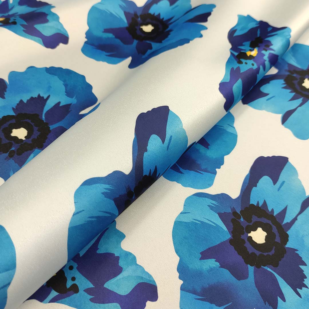 Tessuto Duchesse a fantasia motivo floreale bianco – blu elettrico