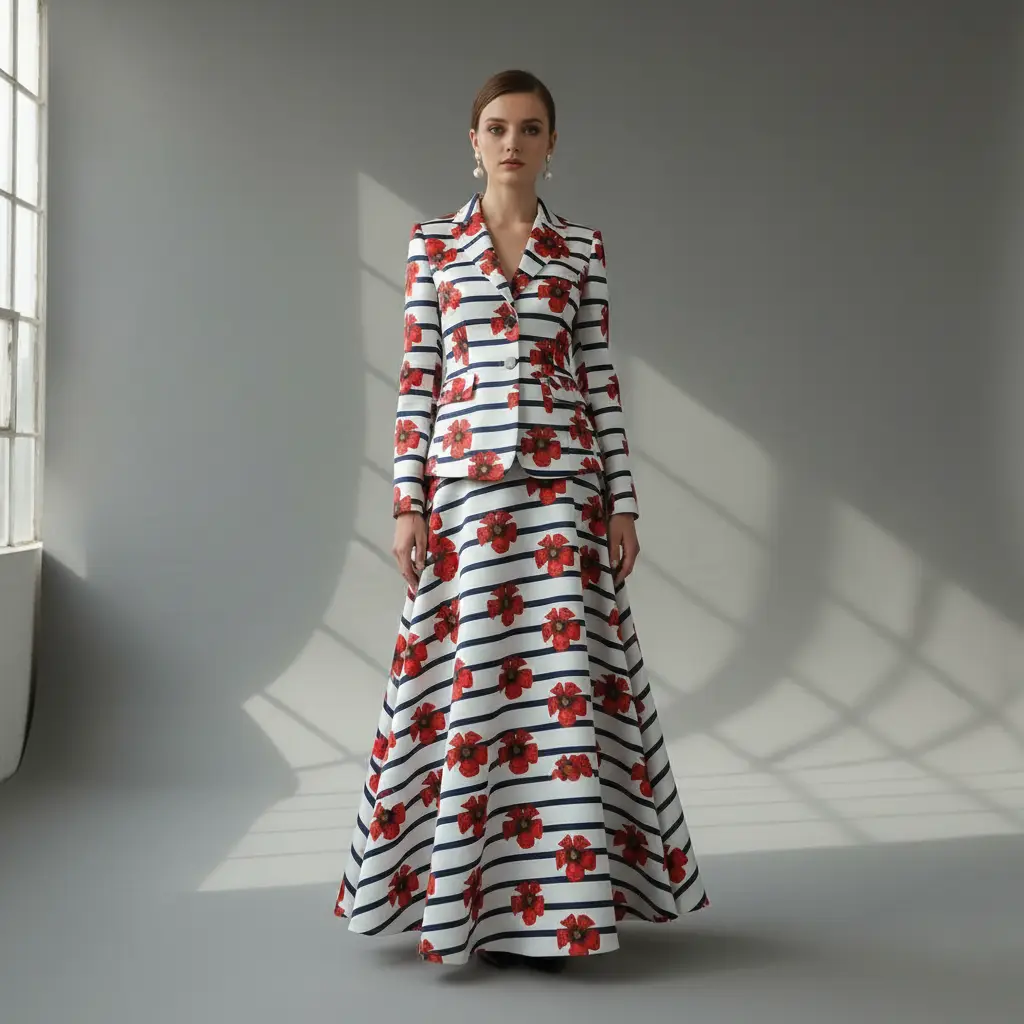 Tessuto Duchesse a fantasia dalla mano semirigida e rasata, dall’aspetto semilucido ideale per realizzare capi da cerimonia come: gonnelloni, abiti, gonne, giacche, tailleur e basi per abiti da sposa.