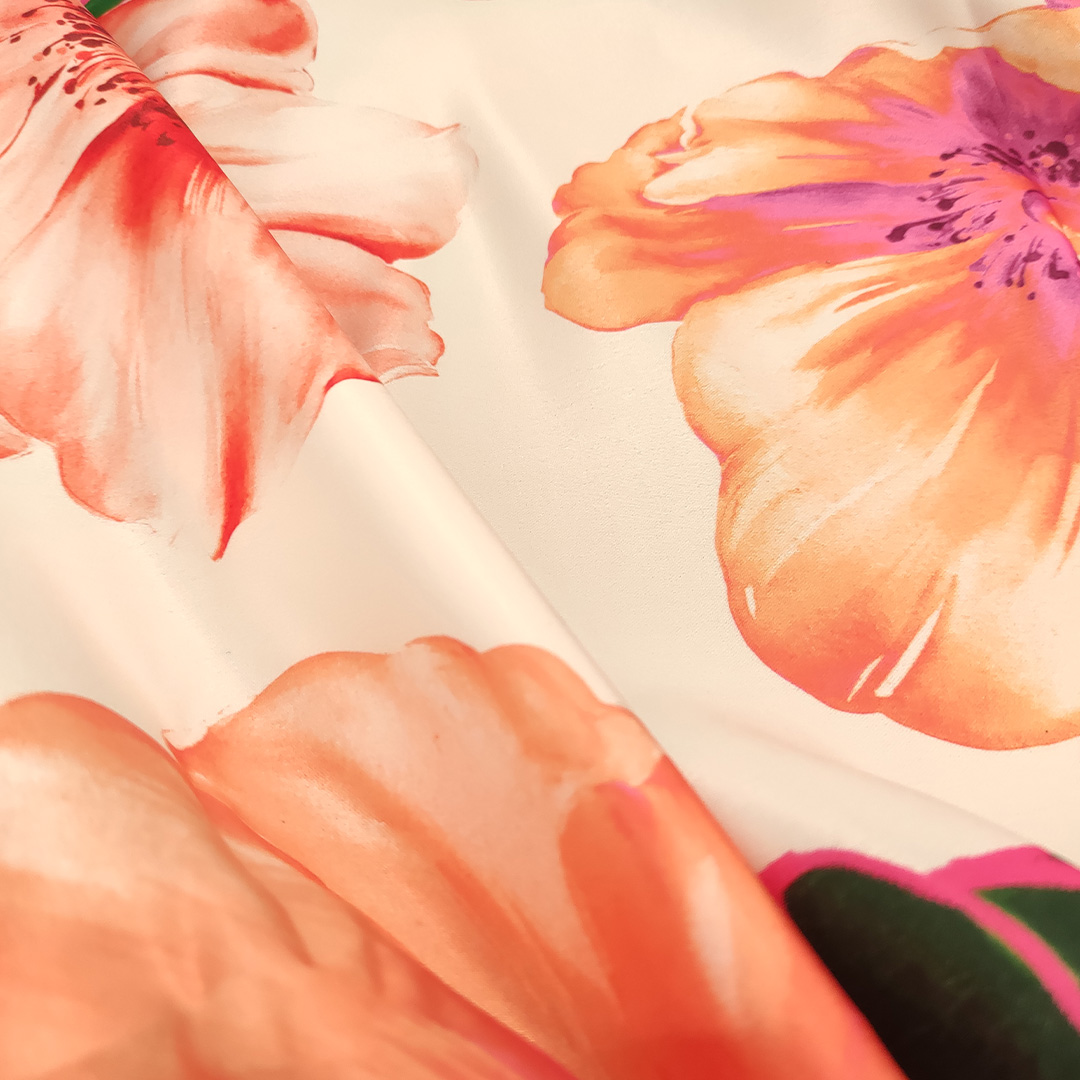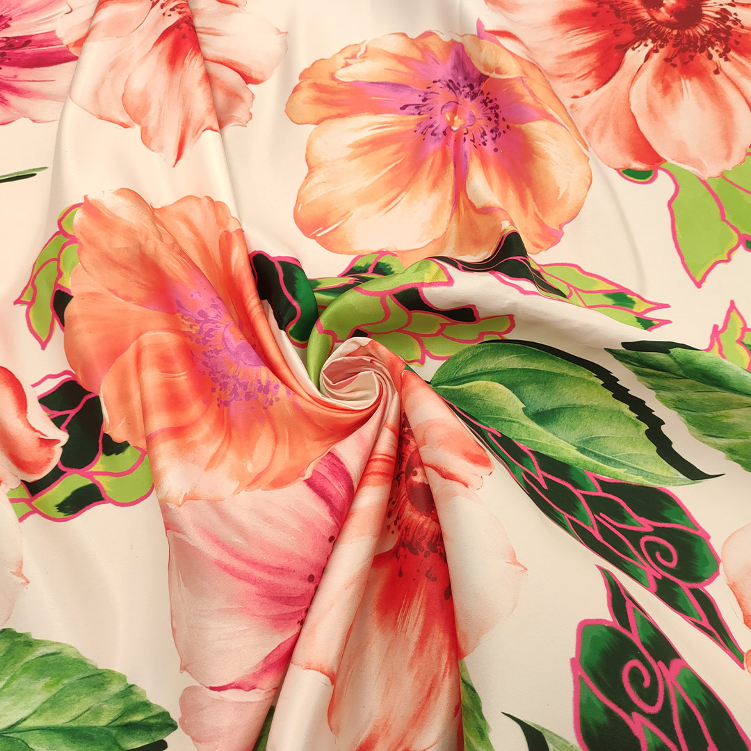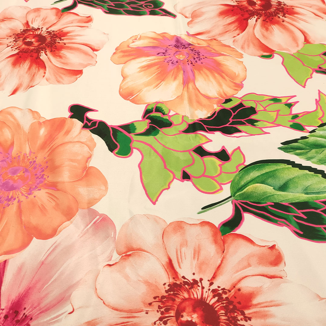Tessuto Duchesse a fantasia motivo floreale bianco – verde – pesco – nero