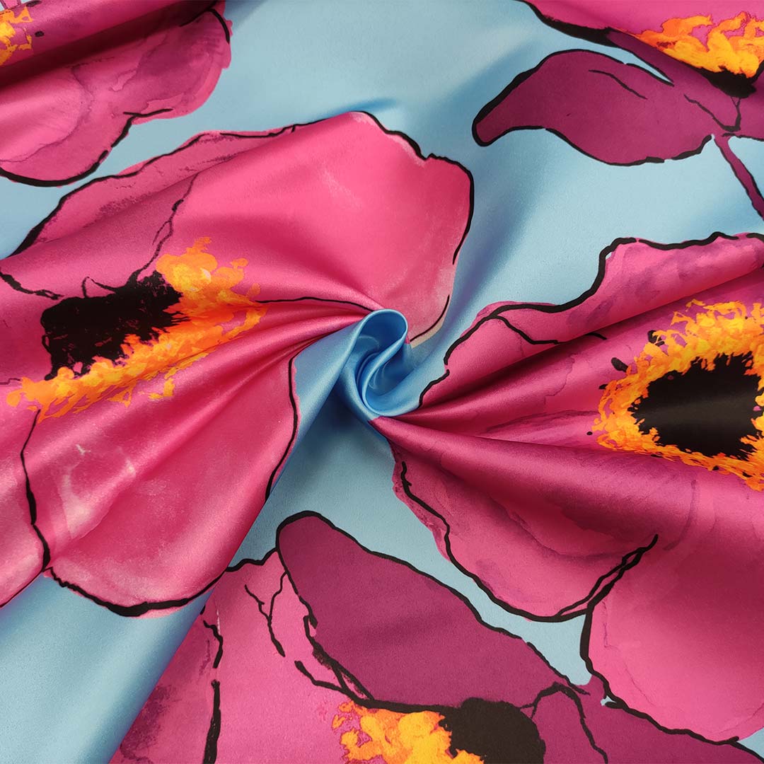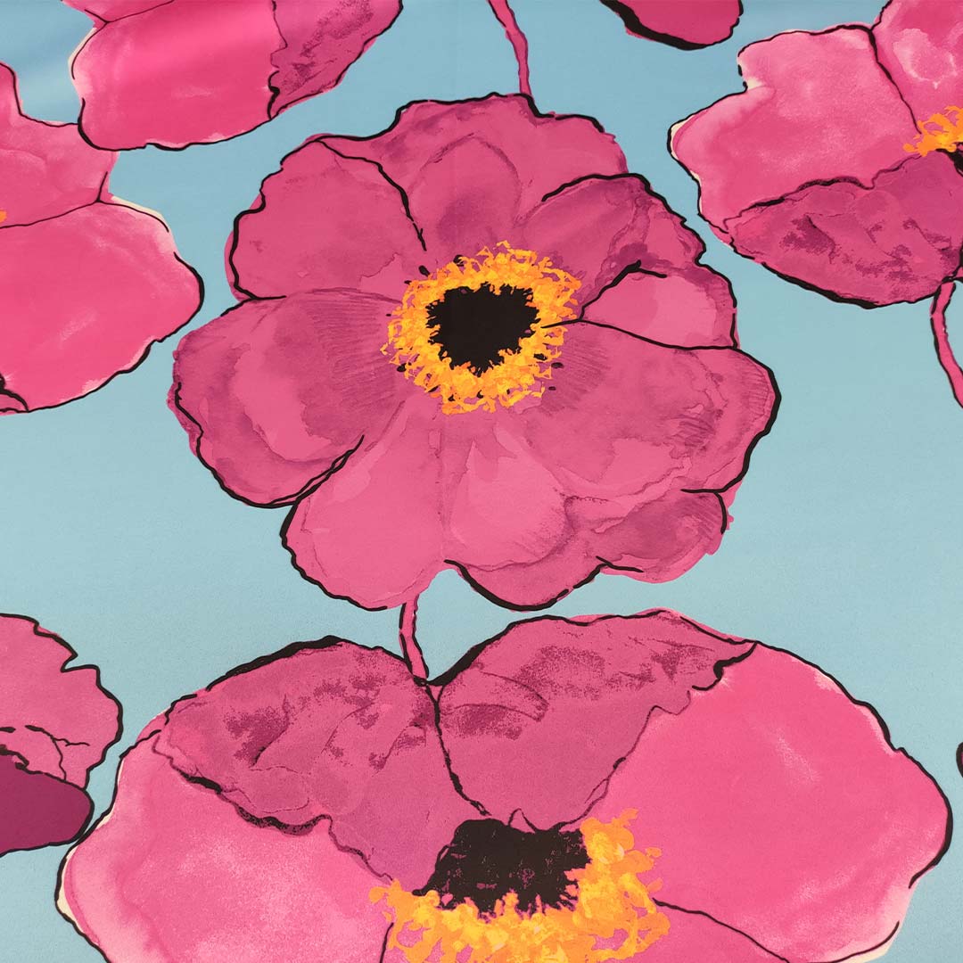 Tessuto Duchesse a fantasia motivo floreale celeste – fucsia