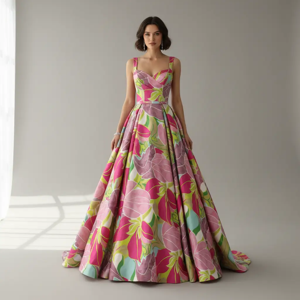 Tessuto Duchesse a fantasia motivo floreale fucsia – rosa – acquamarina