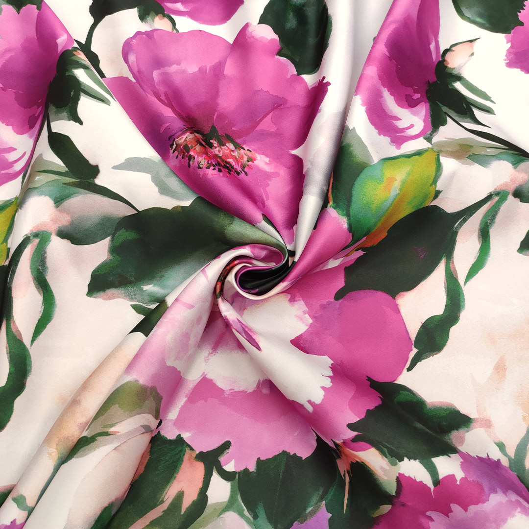 Tessuto Duchesse a fantasia motivo floreale fucsia – verde – bianco