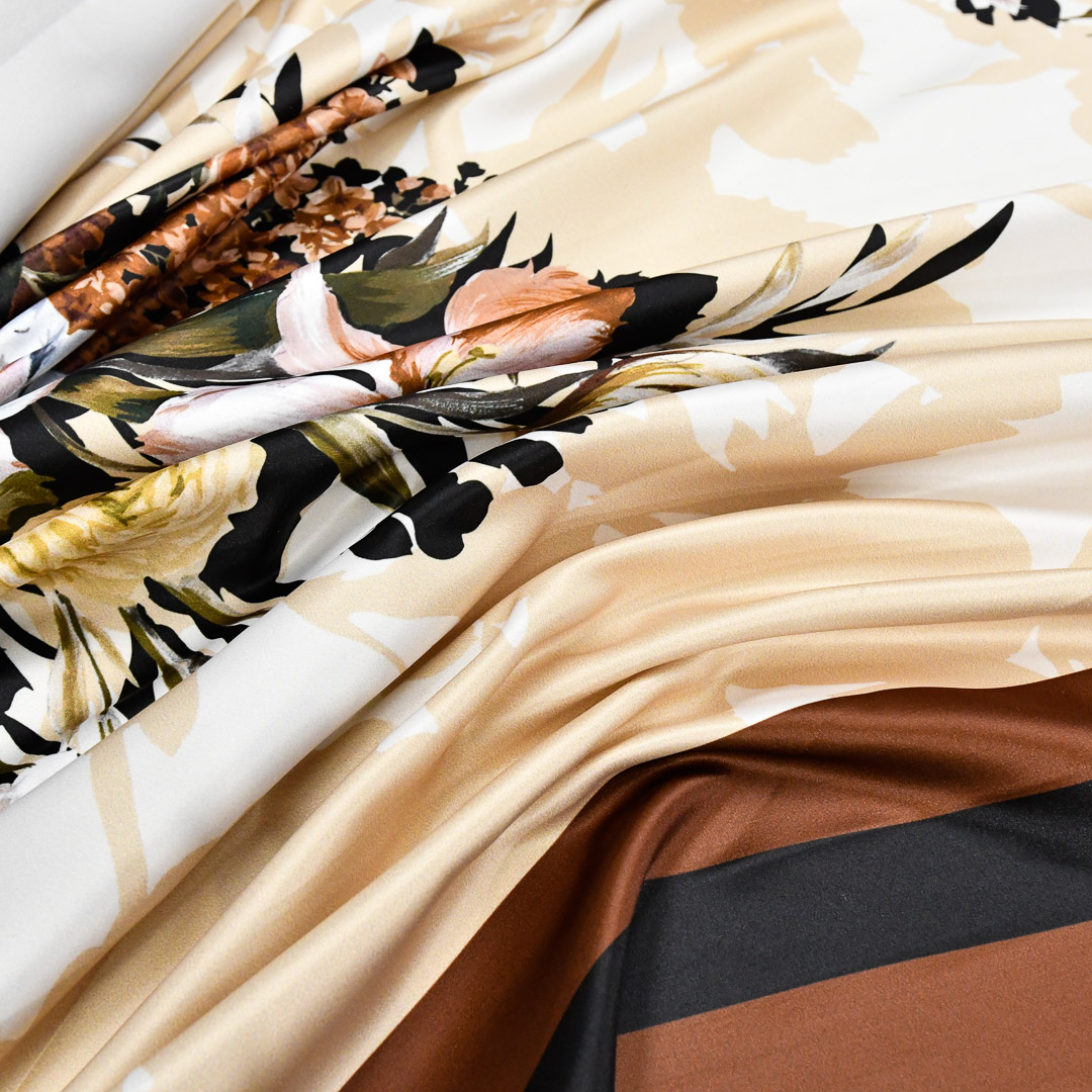 Tessuto Duchesse a fantasia dalla mano semirigida e rasata, dall’aspetto semilucido ideale per realizzare capi da cerimonia come: gonnelloni, abiti, gonne, giacche, tailleur e basi per abiti da sposa.