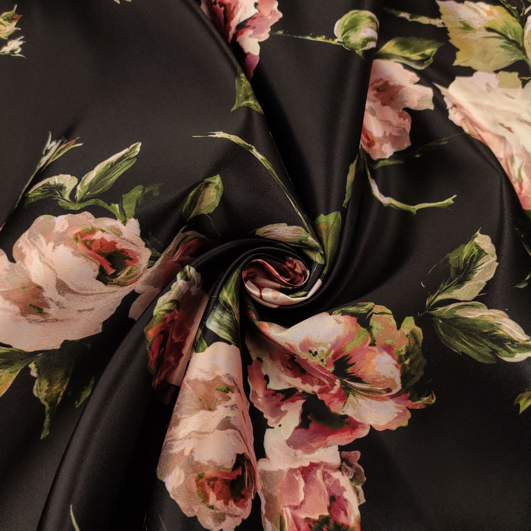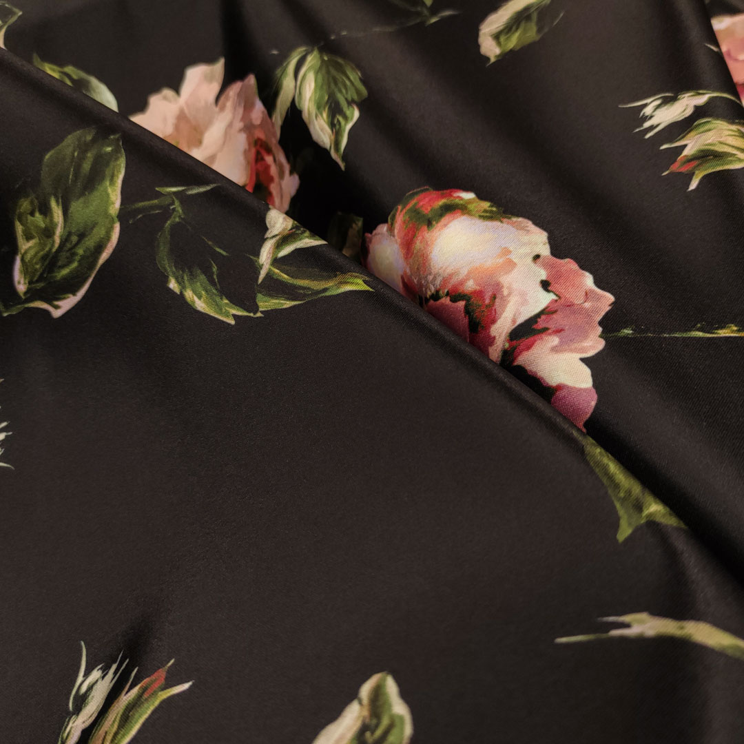 Tessuto Duchesse a fantasia motivo floreale nero – verde – rosa
