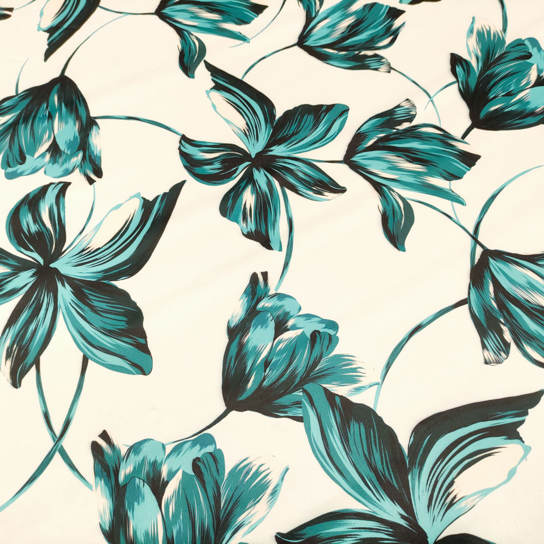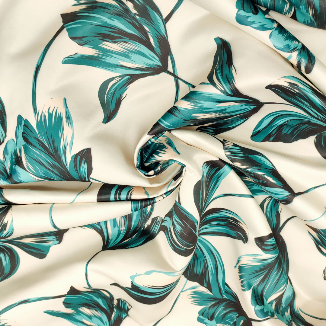 Tessuto Duchesse a fantasia motivo floreale panna – petrolio