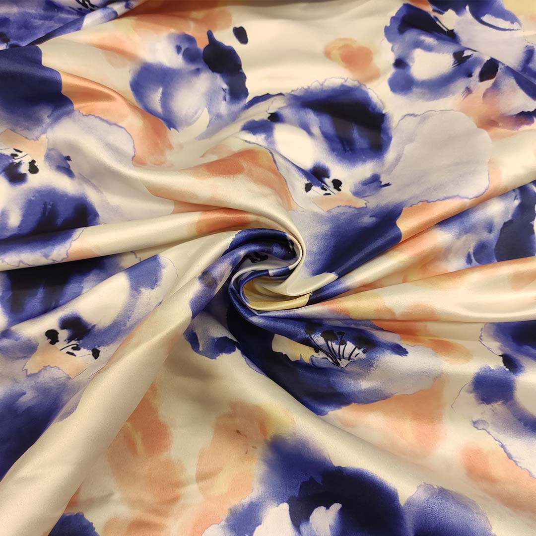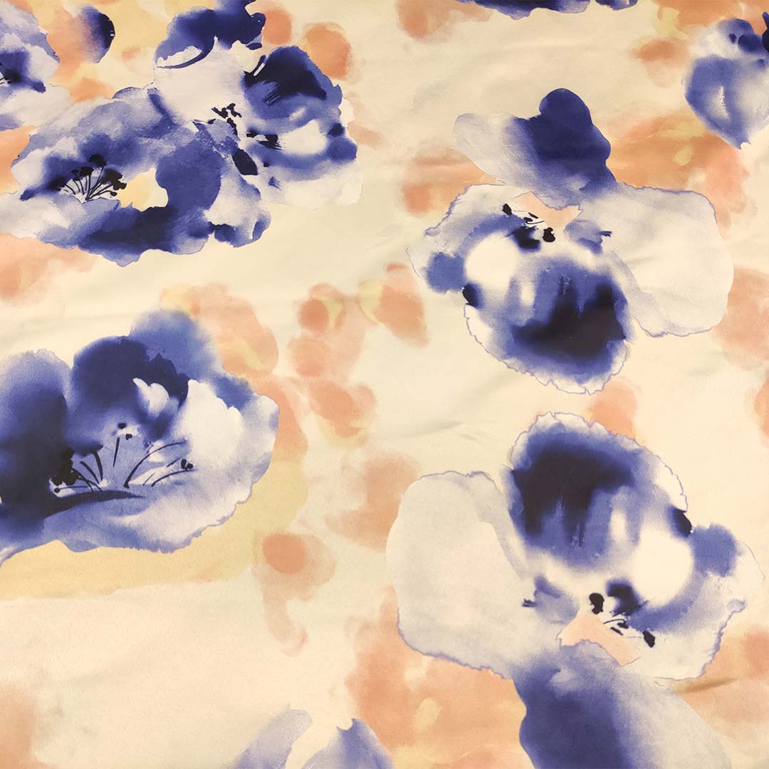 Tessuto Duchesse a fantasia motivo floreale pesco – very peri – panna