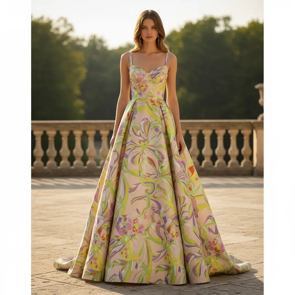 Tessuto Duchesse a fantasia dalla mano semirigida e rasata, dall’aspetto semilucido ideale per realizzare capi da cerimonia come: gonnelloni, abiti, gonne, giacche, tailleur e basi per abiti da sposa.