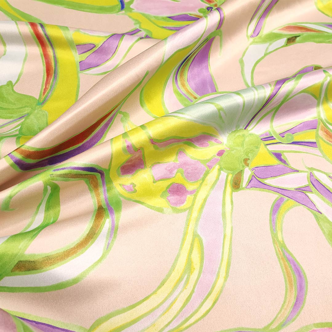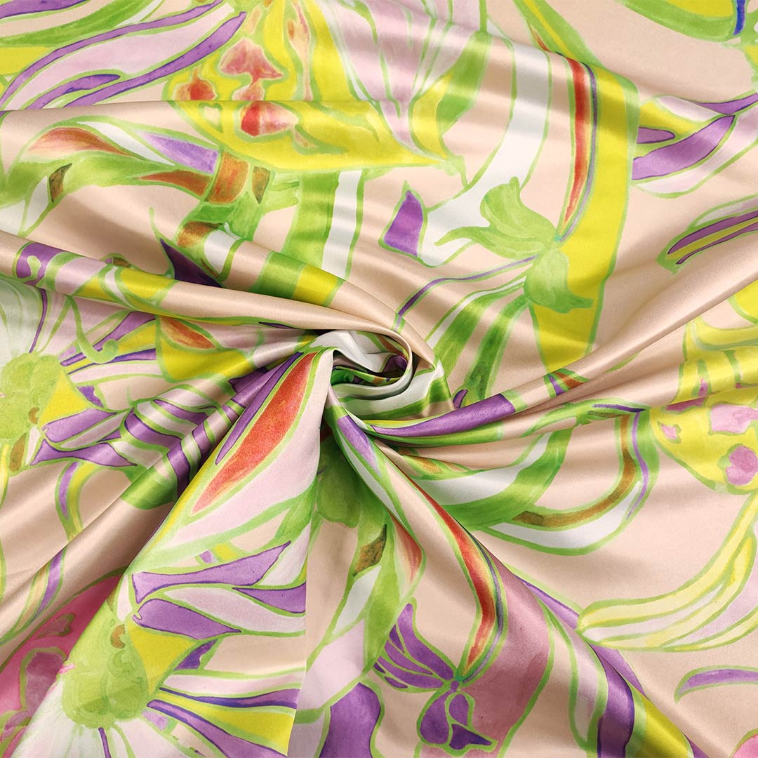 Tessuto Duchesse a fantasia motivo floreale rosa – verde acido – viola