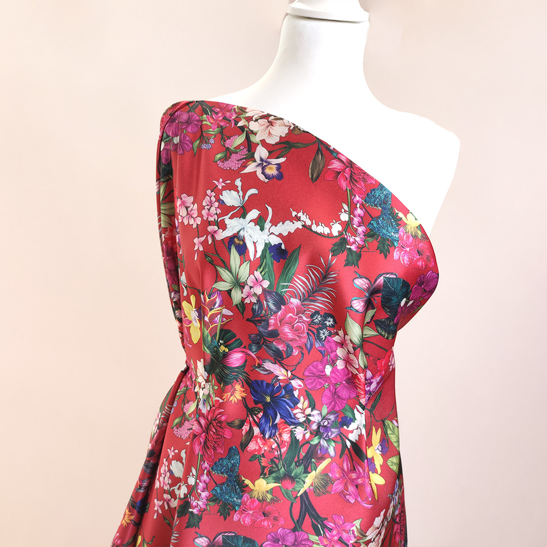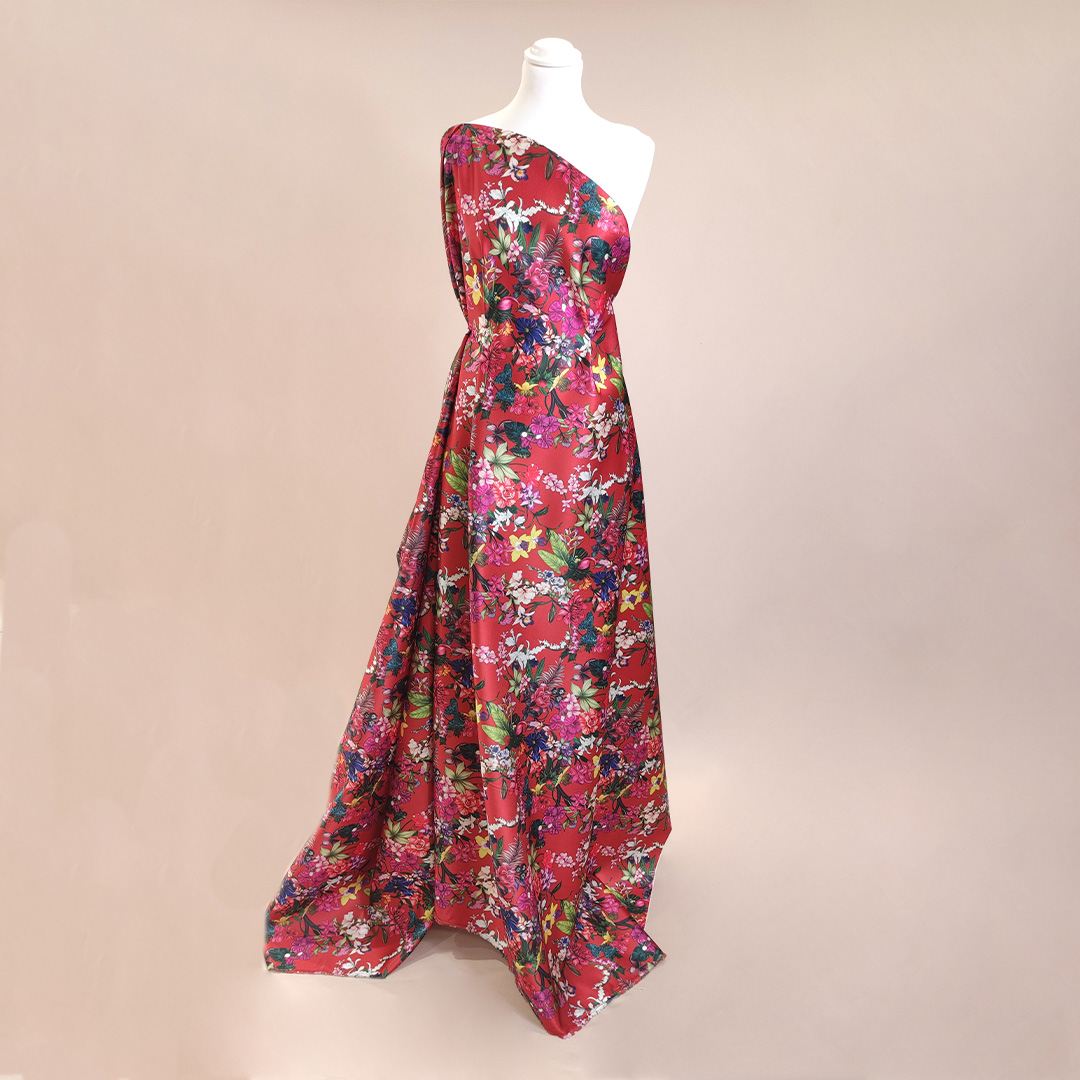 Tessuto Duchesse a fantasia motivo floreale rosso – blu – fucsia