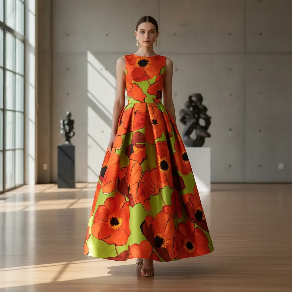 Tessuto Duchesse a fantasia motivo floreale verde fluo – arancione
