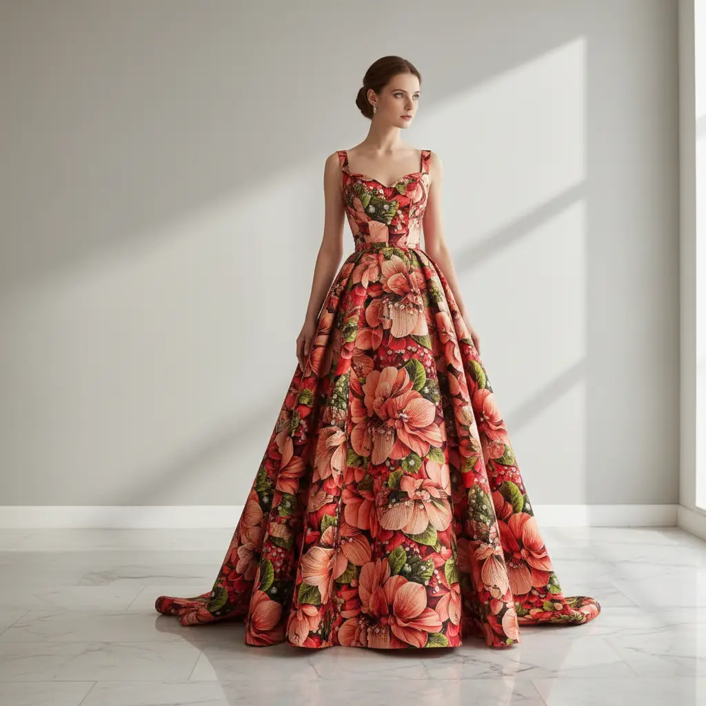 Tessuto Duchesse a fantasia motivo floreale verde – rosso – corallo