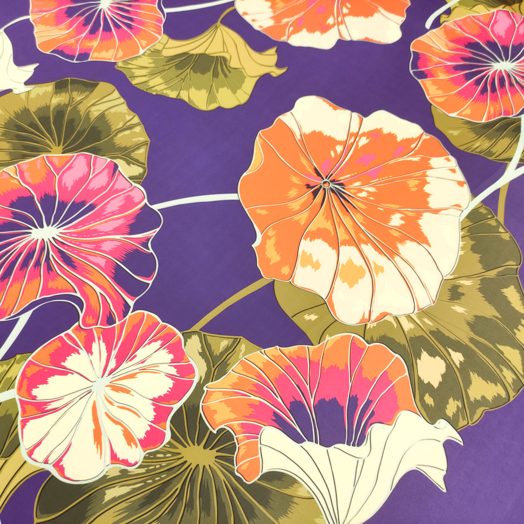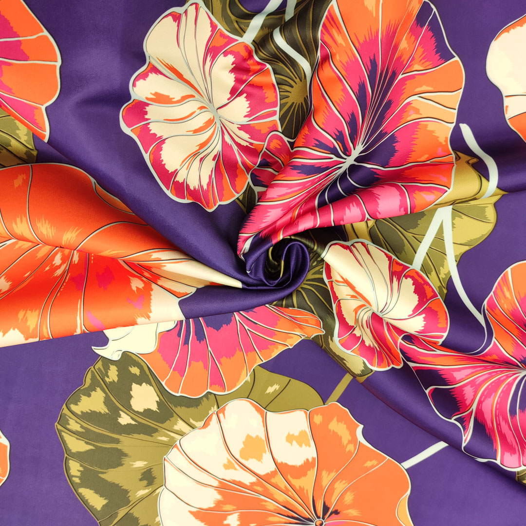Tessuto Duchesse a fantasia motivo floreale viola – fucsia – verde