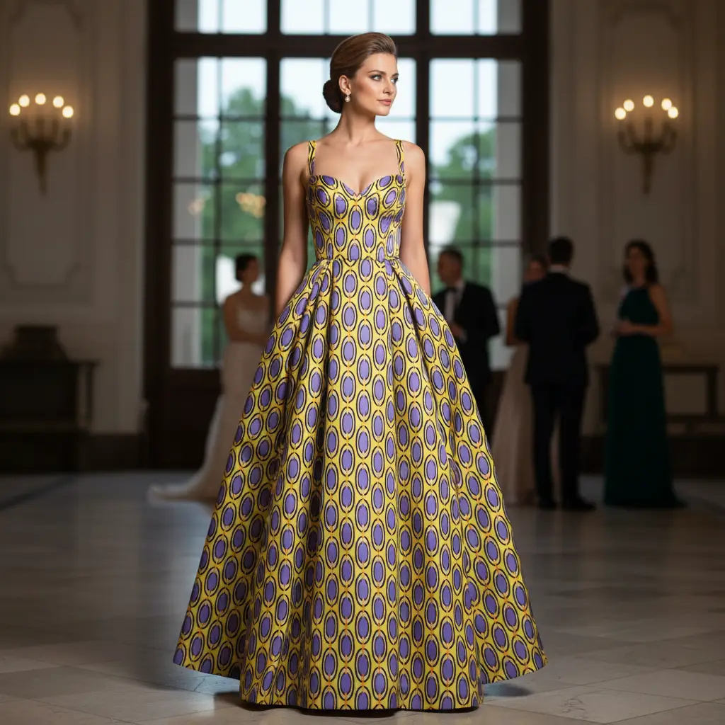 Tessuto Duchesse a fantasia dalla mano semirigida e rasata, dall’aspetto semilucido ideale per realizzare capi da cerimonia come: gonnelloni, abiti, gonne, giacche, tailleur e basi per abiti da sposa.
