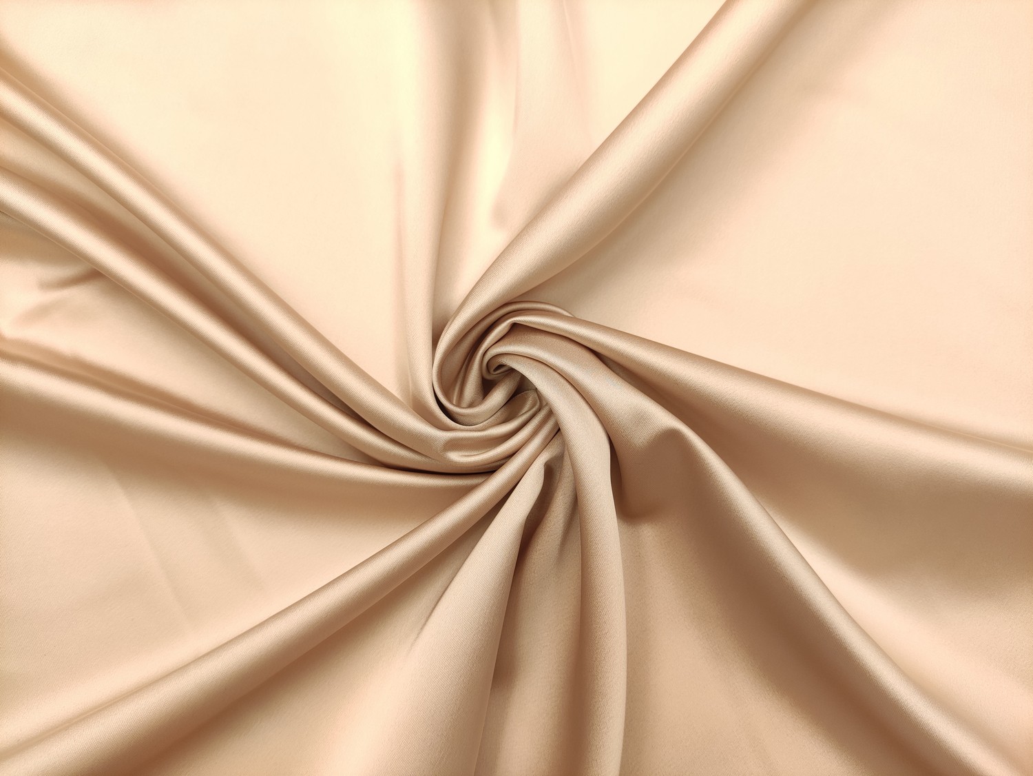 Tessuto Duchesse elasticizzato in tinta unita dalla mano semirigida e rasata, dall’aspetto lucido, ideale per realizzare capi da cerimonia come: gonnelloni, abiti, gonne, giacche, tailleur e basi per abiti da sposa. La sua leggera elasticità aumenta la vestibilità e la capacità di adattarsi a tutte le forme del corpo.