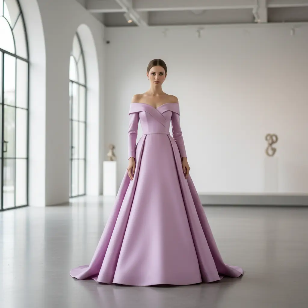 Tessuto Duchesse in tinta unita dalla mano morbida e rasata, dall’ aspetto semilucido ideale per realizzare capi da cerimonia come: gonnelloni, abiti, gonne, giacche, tailleur e basi per abiti da sposa.