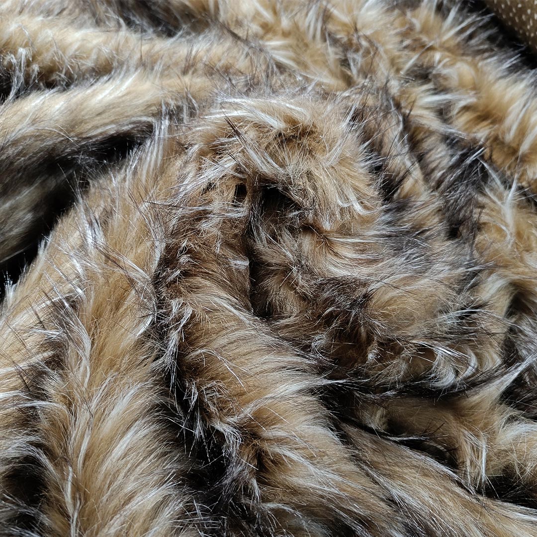 Tessuto Eco Pelliccia a pelo lungo motivo sfumato cammello – nero – bianco