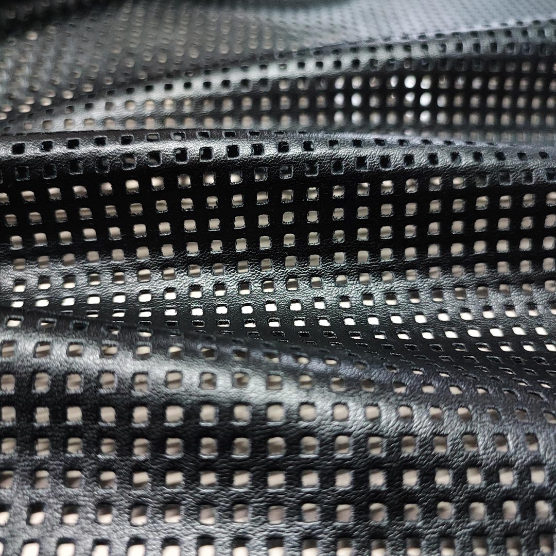 Tessuto Ecopelle elasticizzata per abbigliamento motivo traforato dalla mano morbida e resistente all’usura, ideale per realizzare capi sartoriali come: giacche, gonne, abiti e pantaloni.