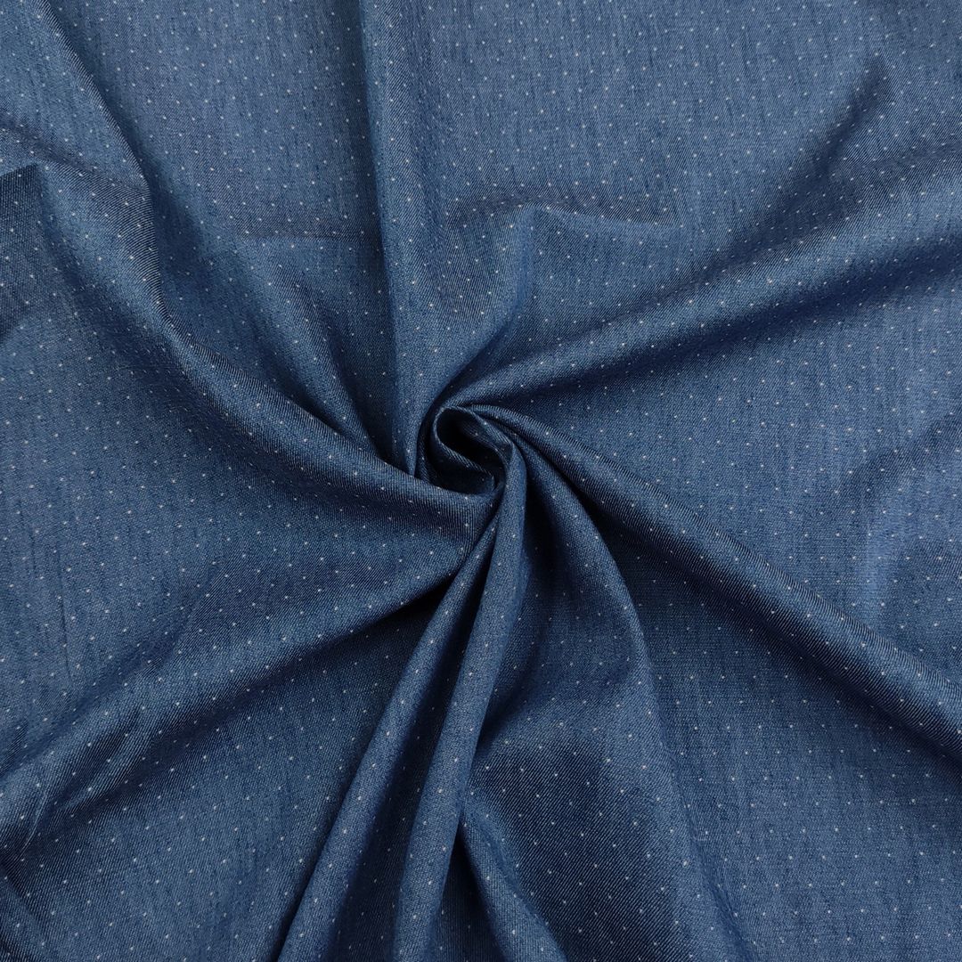 Tessuto Jeans Chambray motivo pois dalla mano leggera, morbida e cadente, leggermente elasticizzato, si presta alla creazione di capi freschi e comodi da utilizzare nella stagione Primavera – Estate come: gonne, pantaloni, spolverini, abiti e gonne.