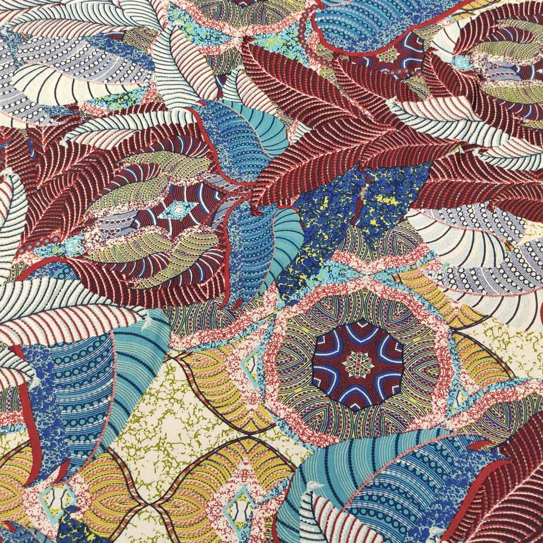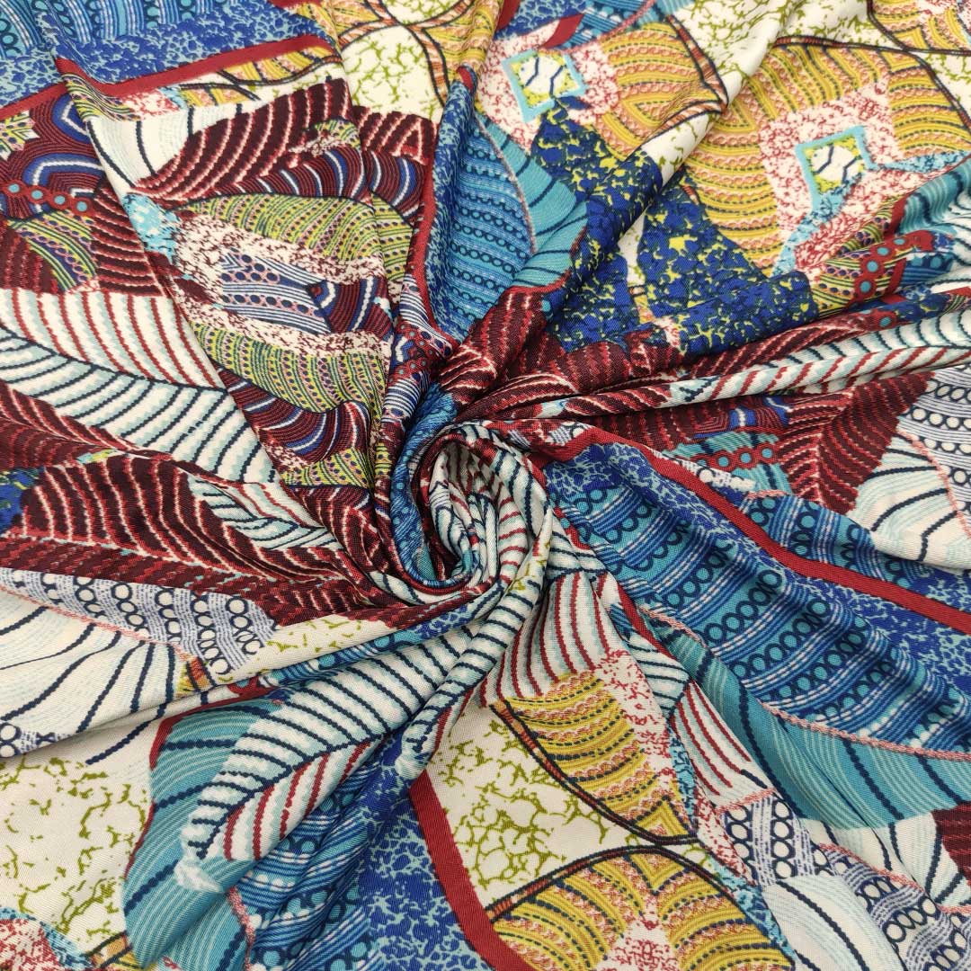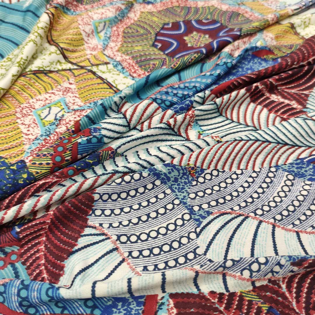Tessuto Jersey a fantasia motivo astratto bordeaux – tiffany – blu navy – ocra