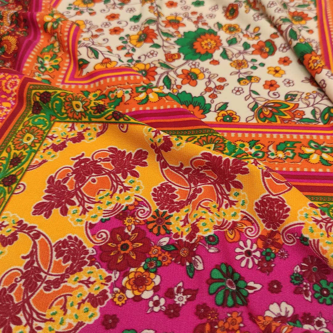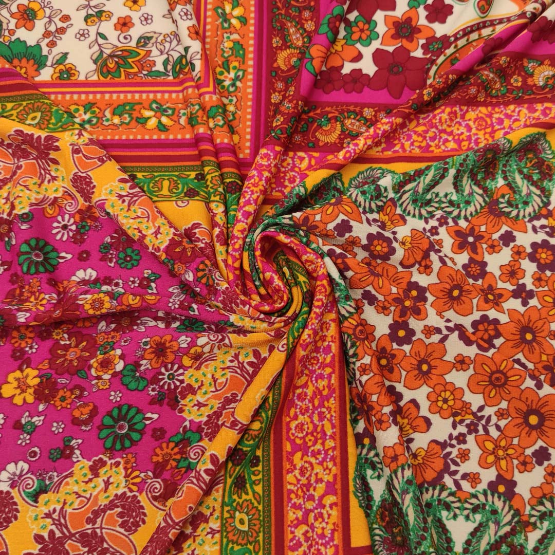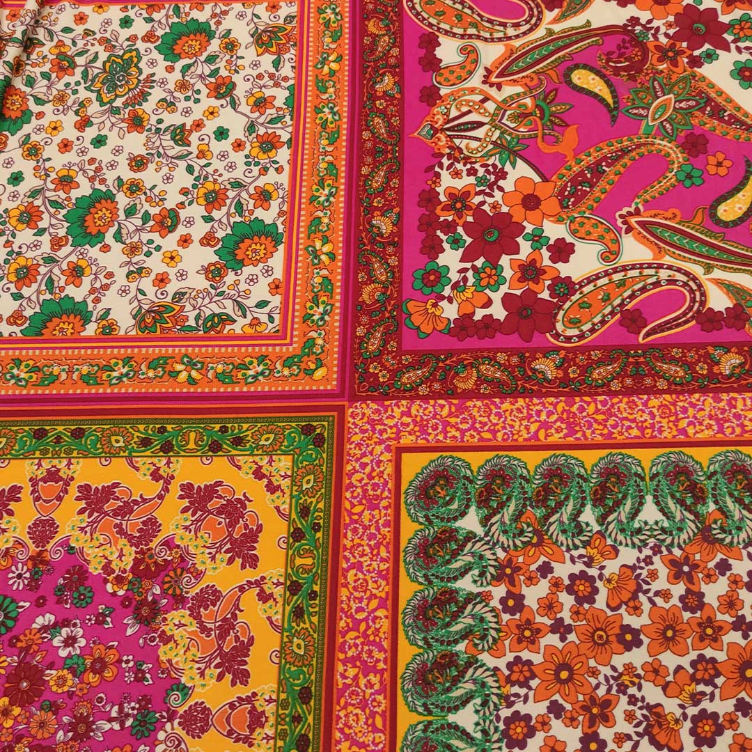 Tessuto Jersey a fantasia motivo etnico fucsia – arancione – verde – bordeaux – viola