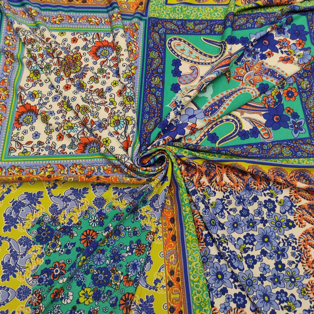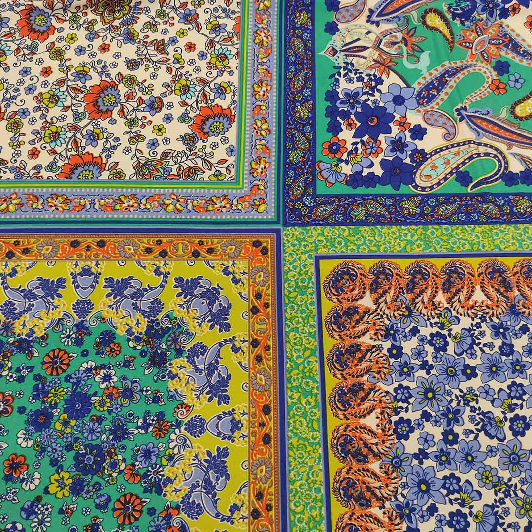 Tessuto Jersey a fantasia motivo etnico ocra – carta da zucchero – verde acido – verde petrolio – arancione – bianco