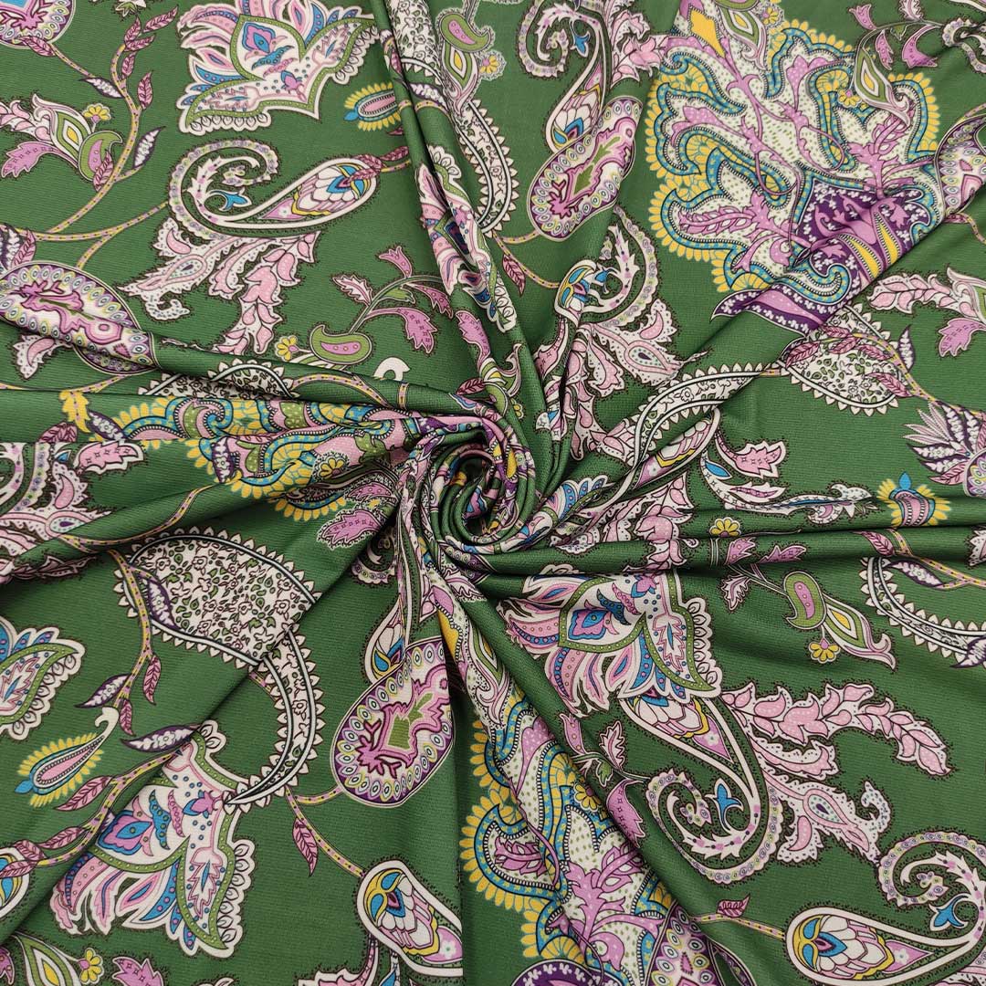 Tessuto jersey a fantasia motivo etnico verde prato – rosa