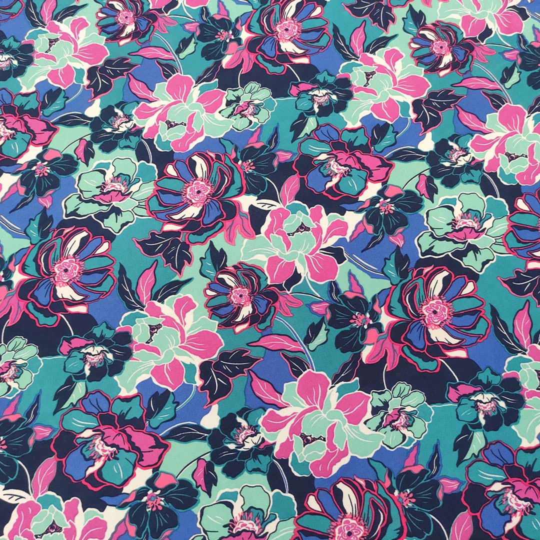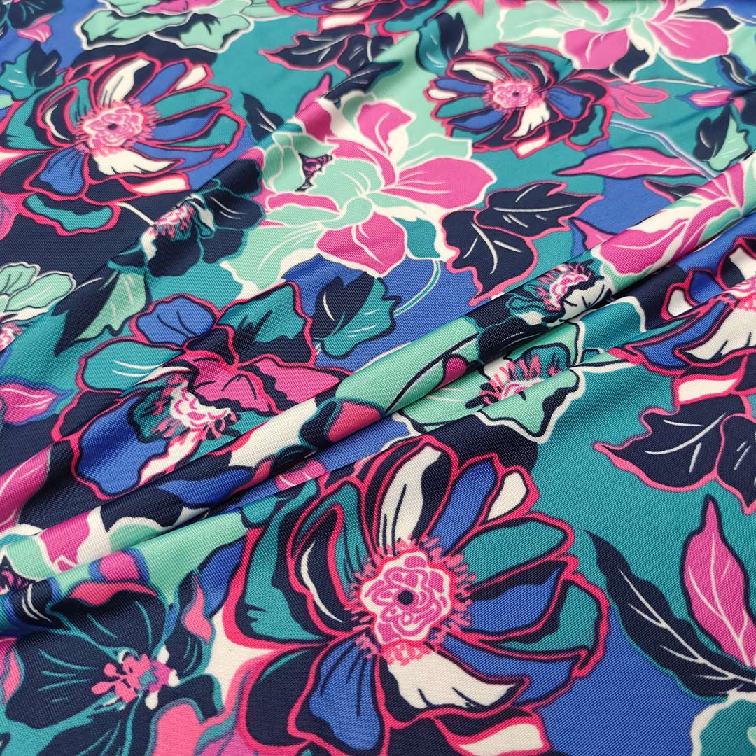 Tessuto Jersey a fantasia motivo floreale fucsia – petrolio – blu navy – tiffany