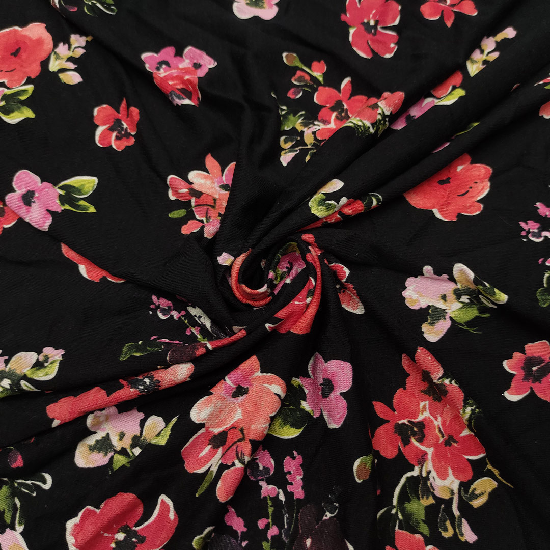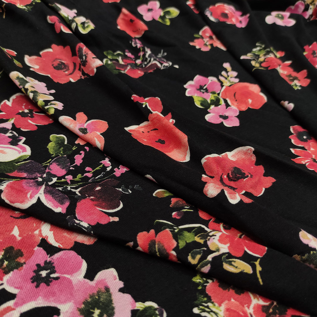 Tessuto Jersey a fantasia motivo floreale nero – rosso – rosa