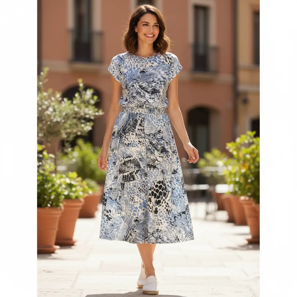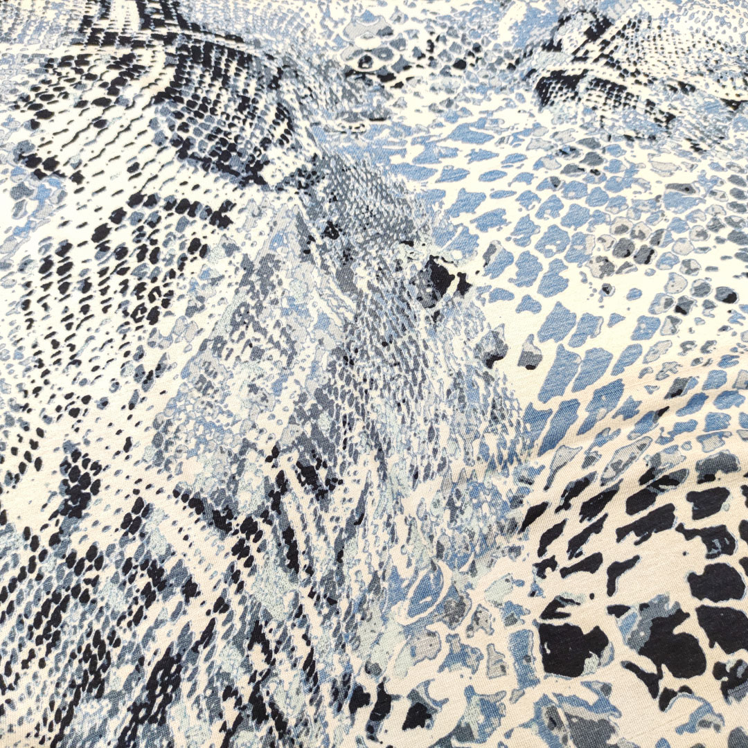 Tessuto Jersey di cotone a fantasia dalla mano morbida e fluida si presta alla creazione di capi freschi e comodi da utilizzare nella stagione primavera – estate.