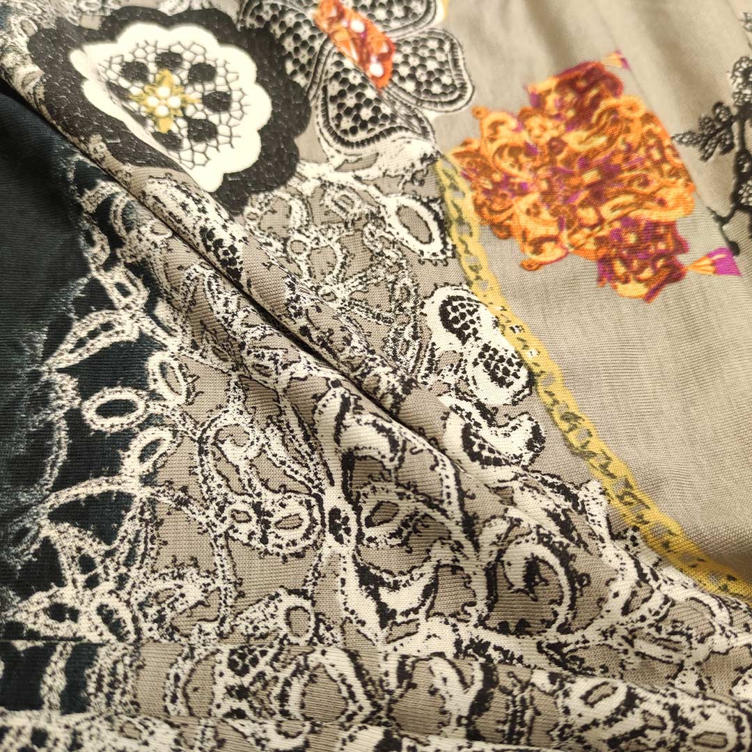 Tessuto Jersey di viscosa a fantasia dalla mano morbida e fluida si presta alla creazione di capi freschi e comodi da utilizzare nella stagione primavera – estate.