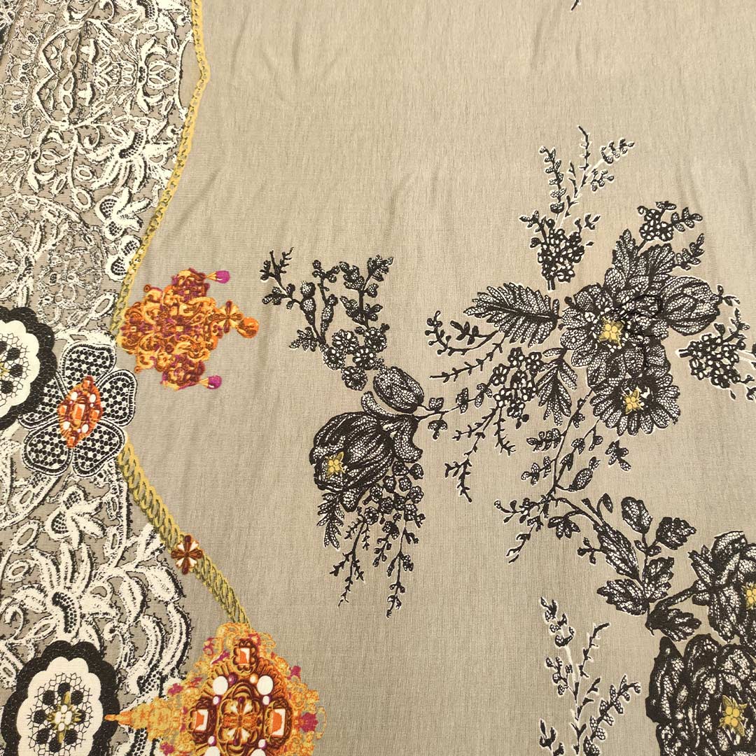 Tessuto Jersey di viscosa a fantasia motivo astratto tortora – bianco – nero