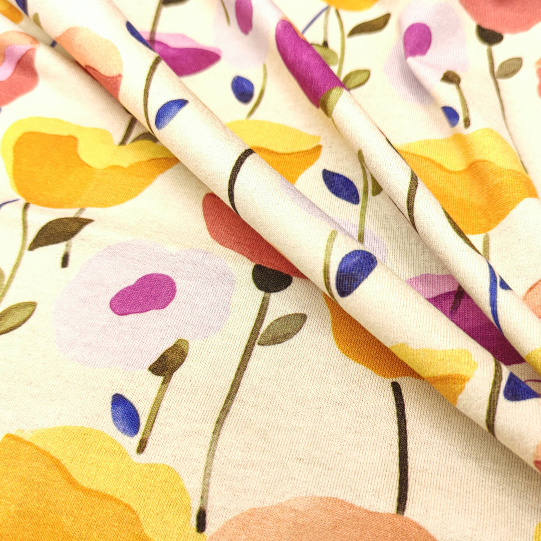 Tessuto Jersey di viscosa a fantasia motivo floreale panna – orchidea – giallo