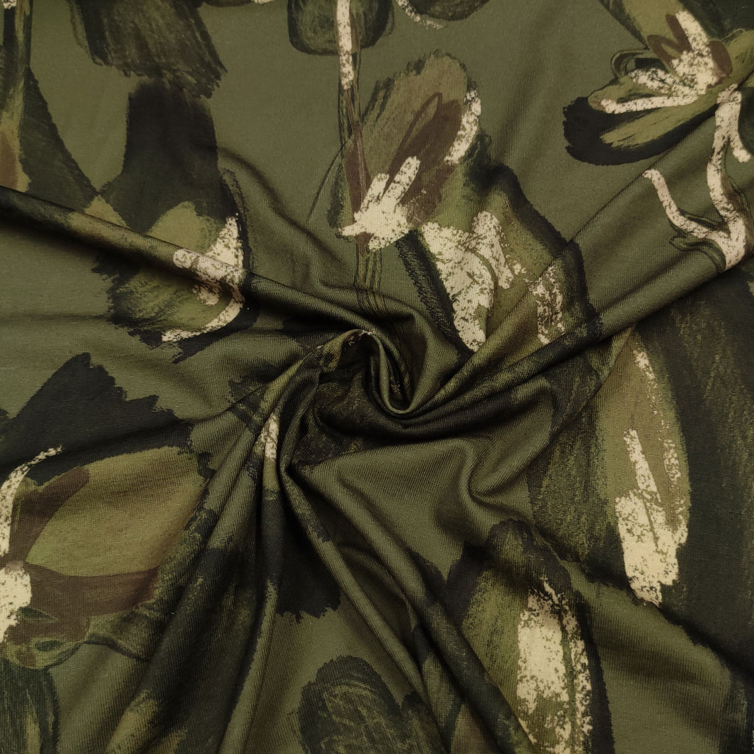 Tessuto jersey di viscosa a fantasia motivo floreale verde militare – marrone – beige