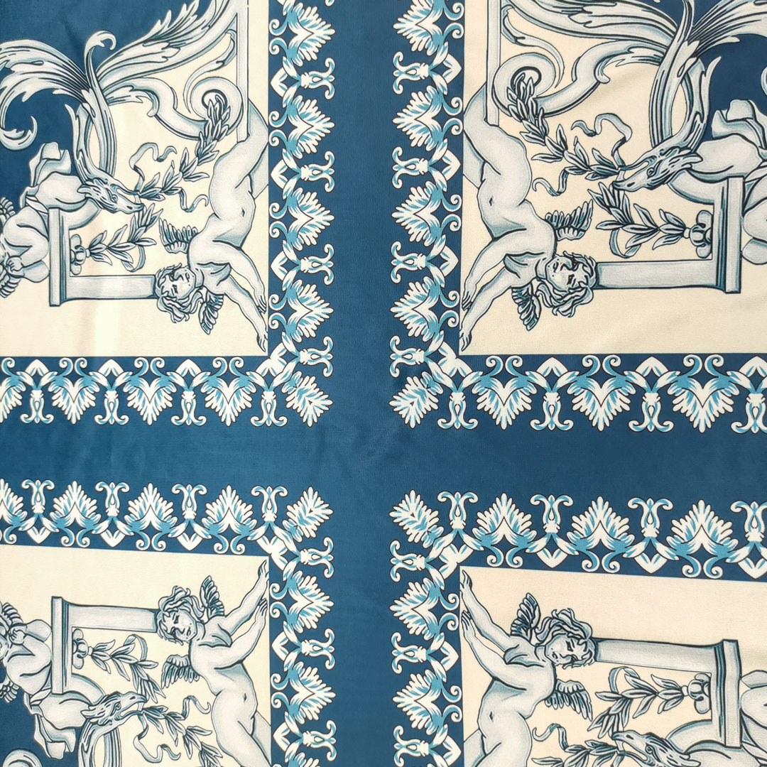 Tessuto Jersey lucido a fantasia motivo floreale barocco beige – blu ottanio